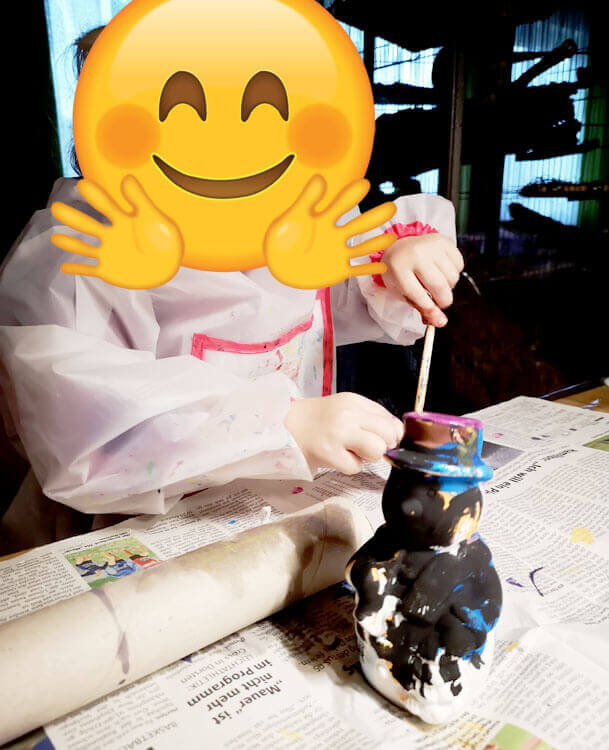 Interessanterweise hat sie bevorzugt den Hut der Schneemannfigur bemalt – dieser war erst braun, dann orange, dann blau, schwarz und zuletzt lila bzw. wieder blau. Zwischendurch hat sie auch drum herum unten gemalt oder die Farbe mit ganz viel Wasser die Figur hinunterlaufen lassen. Da Gips recht saugstark ist, war die Farbe jeweils deckend.