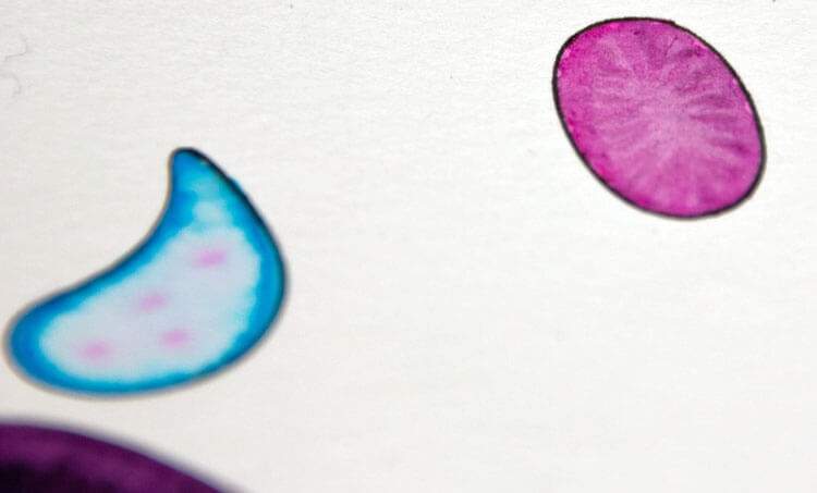 Bei den Formen und Muster im Hintergrund konnte ich wunderbar experimentieren. Ich habe drei verschiedene Farbtöne (Hellblau, Lila und Pink) genommen und jede Form in einer anderen Variation koloriert und die Farben anschließend mit dem Pinsel und viel Wasser ineinander vermalt.