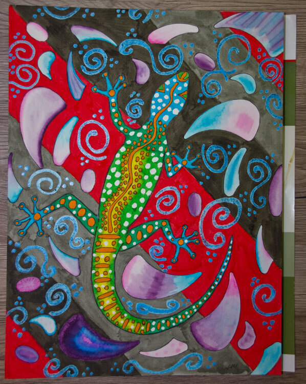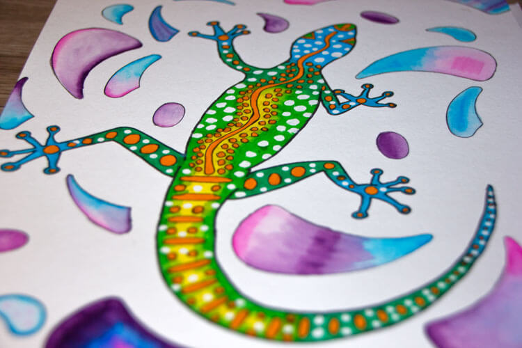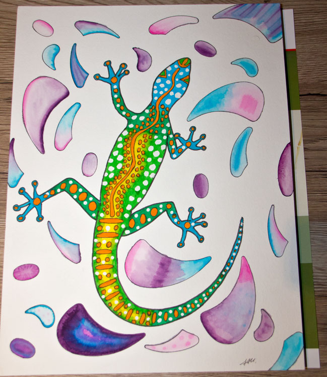 Neben dem Känguru, welches ich letzte Woche schon gezeigt habe, habe ich auch eine Eidechse gemalt, um die es in diesen Artikel geht. Dabei wollte ich auch die Wasservermalbarkeit der Aqua Twins ausprobieren.