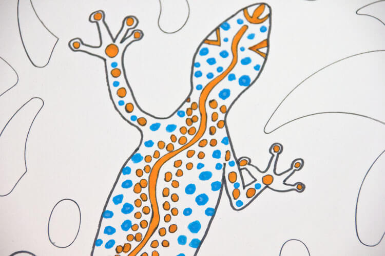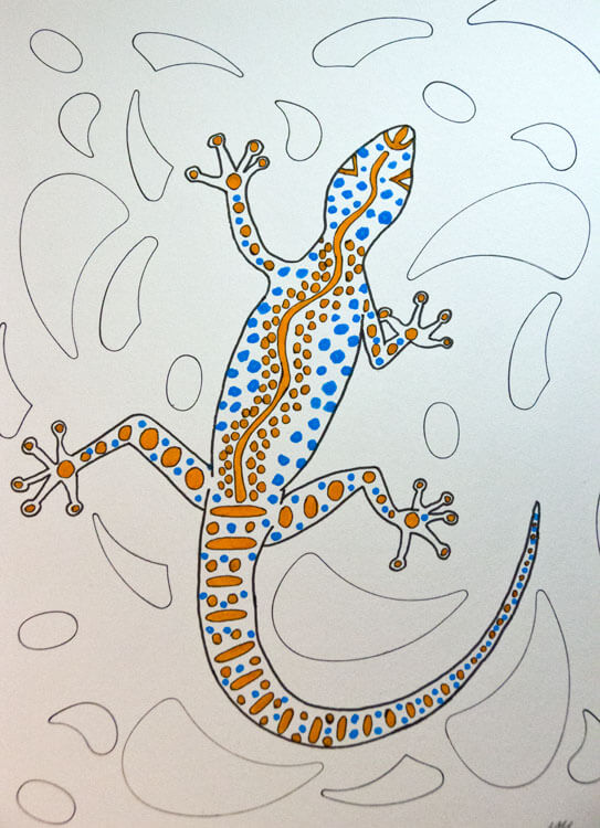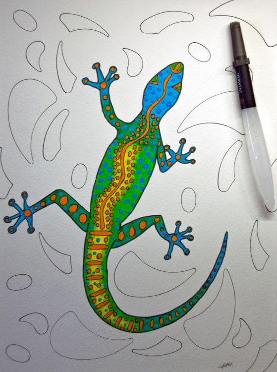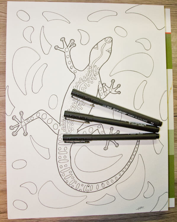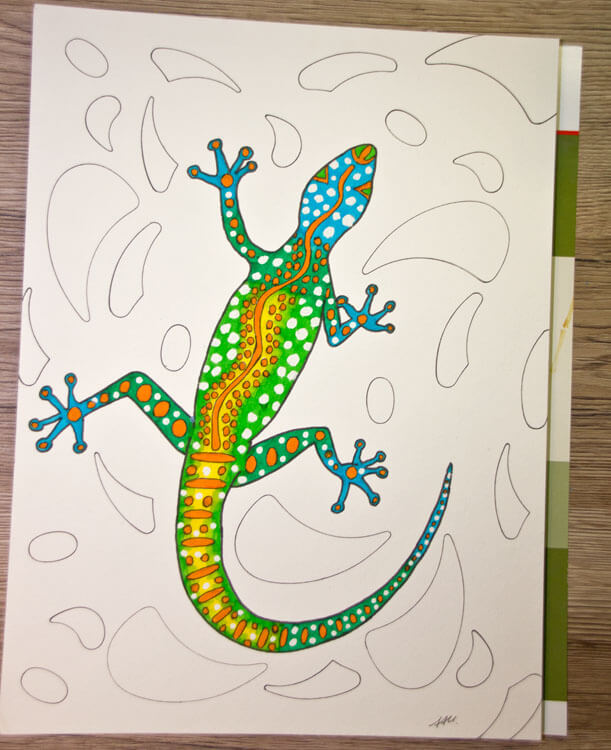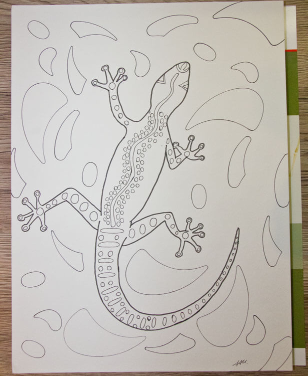 Wie immer fängt bei mir alles mit einer Bleistiftskizze an. Ich habe auf dem Hahnemühle Bamboo* Mixed Media Papier gemalt, weil ich wie bereits erwähnt die Farbe mit Wasser vermalen wollte. Die Eidechse habe ich von meiner gefundenen Vorlage mehr oder weniger abgezeichnet (letztendlich ist meine eigene Interpretation entstanden 😉 ). Für die Muster im Hintergrund habe ich dann noch verschiedene Kurvenlineale* benutzt.