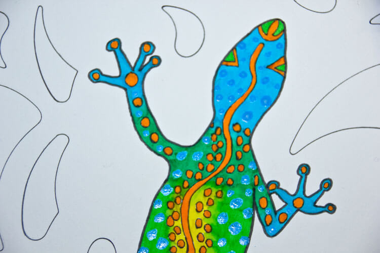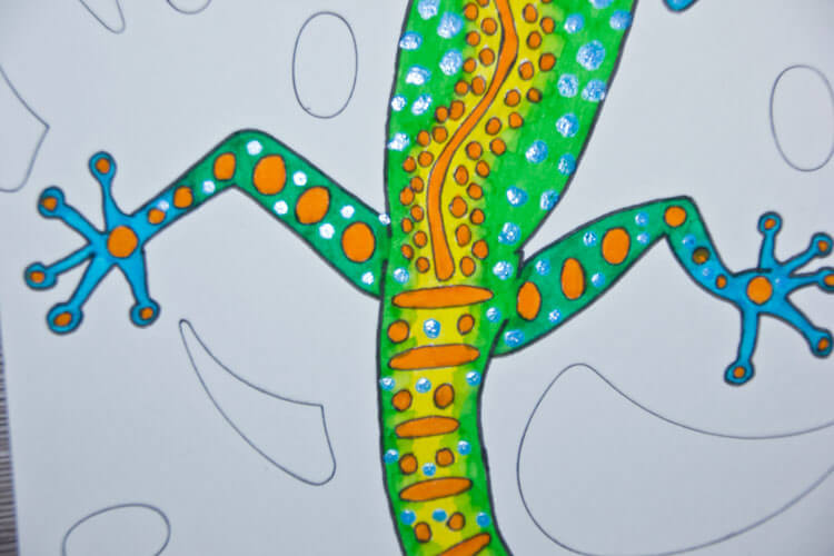 Hier siehst du einzelne Schritte wie ich die Eidechse koloriert habe. Die blauen Beine und den grünen Körper konnte ich mit meinen Derwent Wassertankpinsel* gut ineinander vermalen.