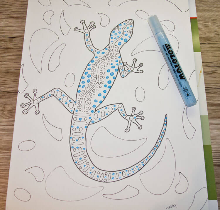 Die Konturen meiner Skizze habe ich dann mit drei verschiedenen Strichstärken meiner Molotow Blackliner Fineliner nachgezogen. Nachdem die schwarze Farbe getrocknet ist, konnte ich vorsichtig die Bleistiftlinien weg radieren. Anschließend habe ich mit einem Molotow Masking Liquid Marker Rubbelkrepp-Punkte auf der Eidechse platziert.
