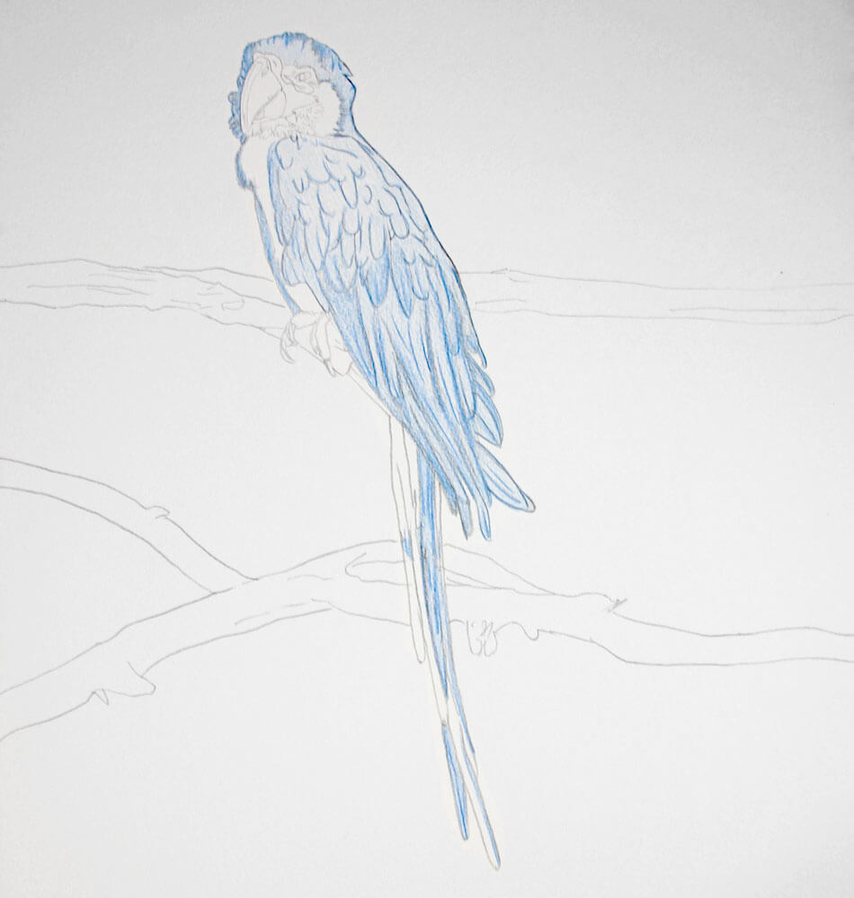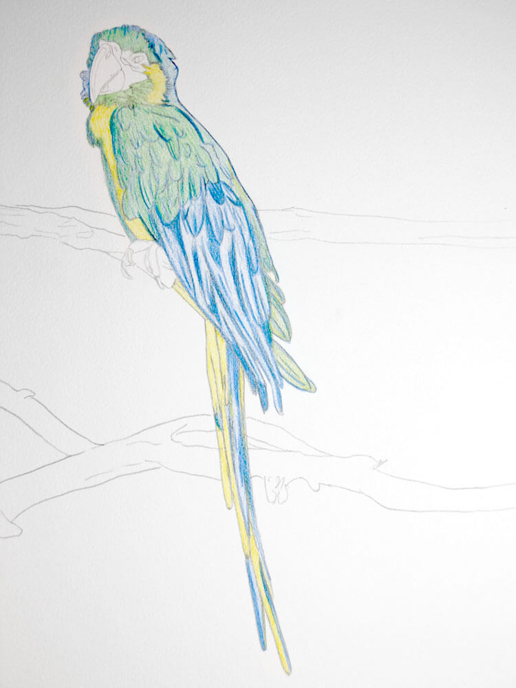 Jedenfalls habe ich den Papagei dann mit meinem Druckbleistift* auf einen vorab heraus getrennten Aquarellbogen übertragen.