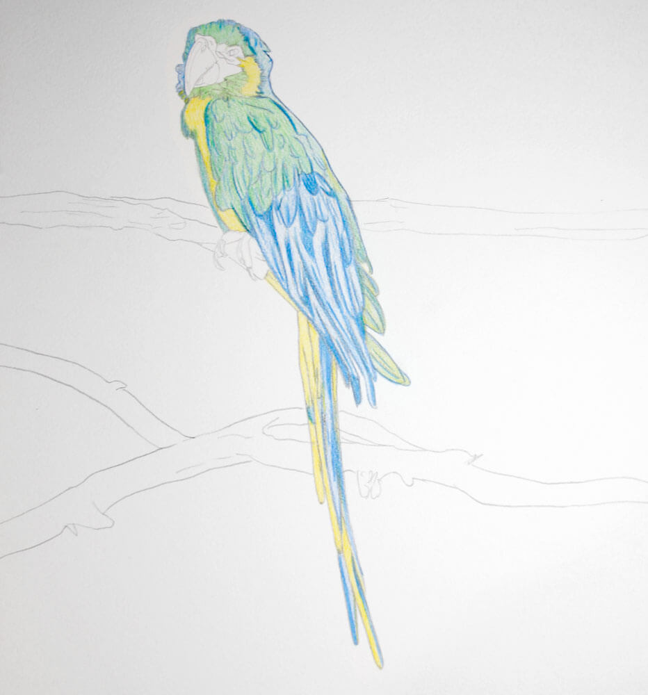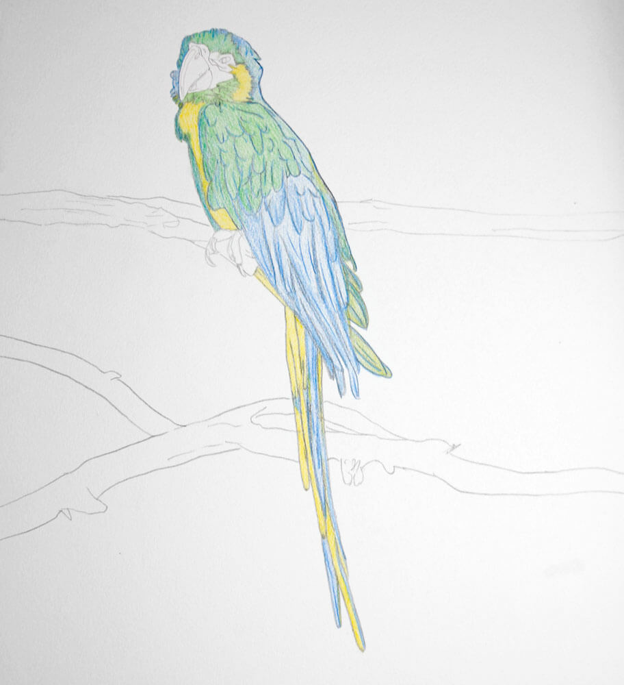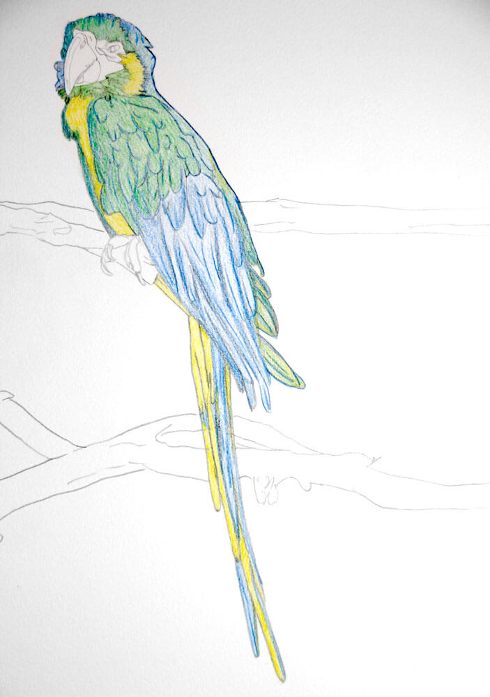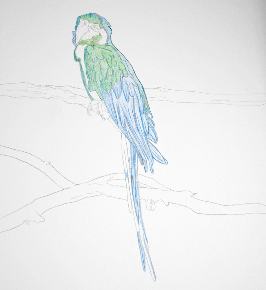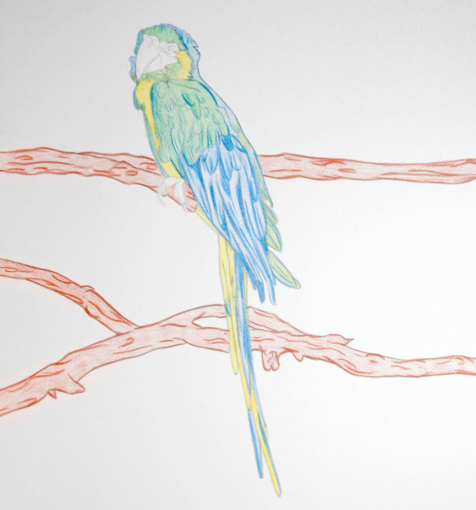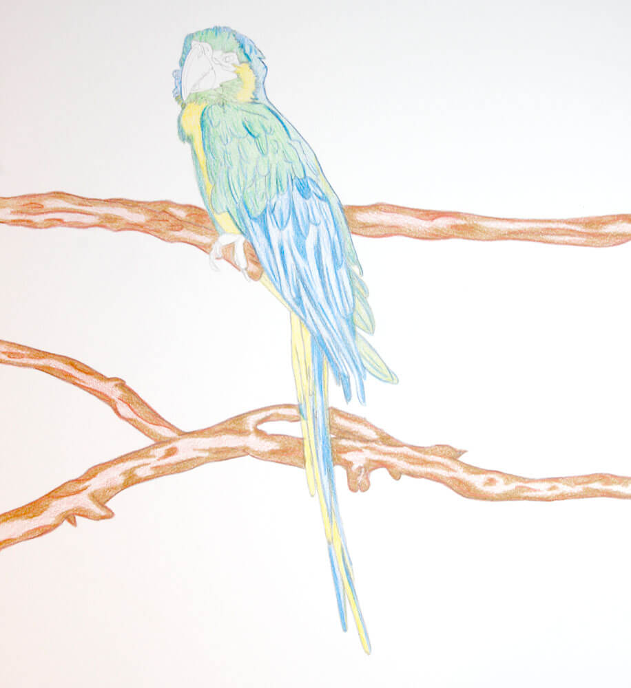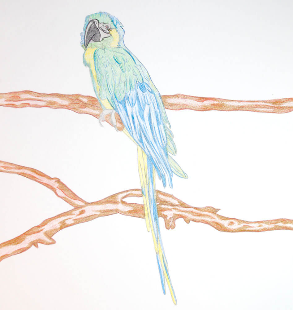 Ich wollte den Vogel möglichst komplett und in naturnaher Umgebung wiedergeben (also beispielsweise auf einem Ast sitzend), so ergab sich automatisch auch schon die vertikale Bildausrichtung. Farblich wollte ich einen schönen Kontrast zwischen Papagei und Hintergrund haben. Ich denke, mit der gewählten Vorlage habe ich meine eigenen Vorgaben soweit getroffen: