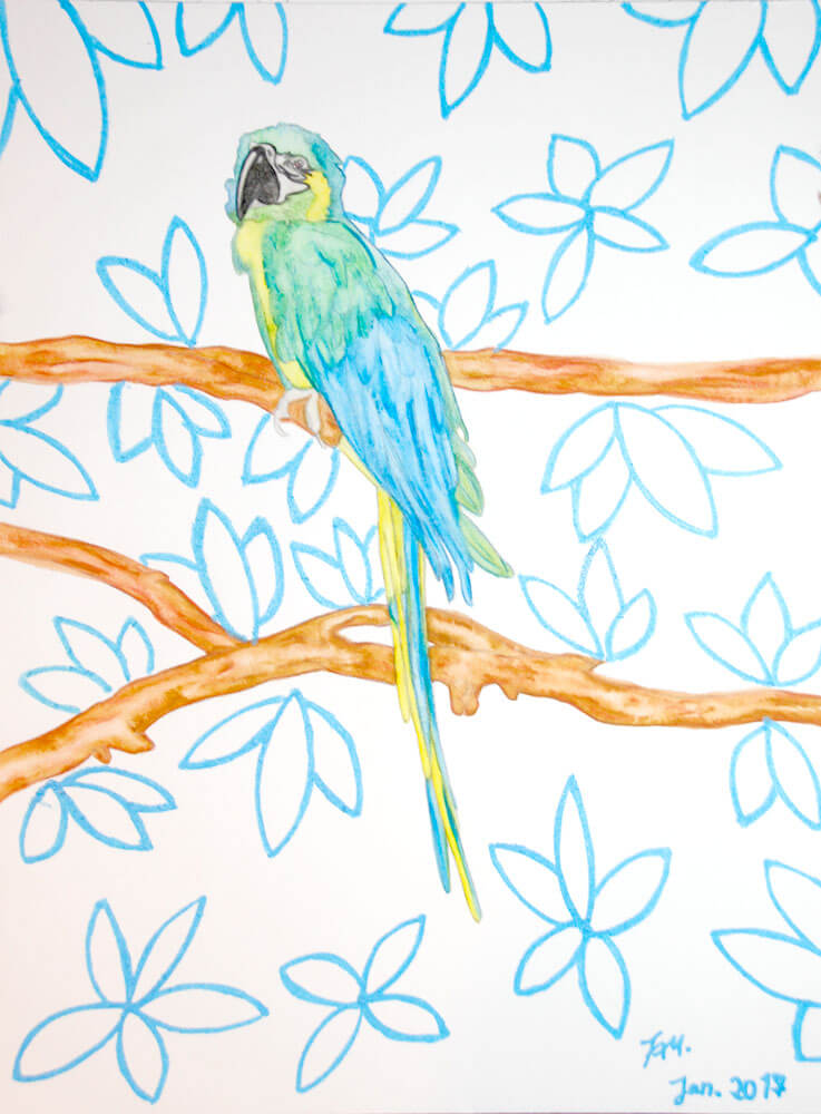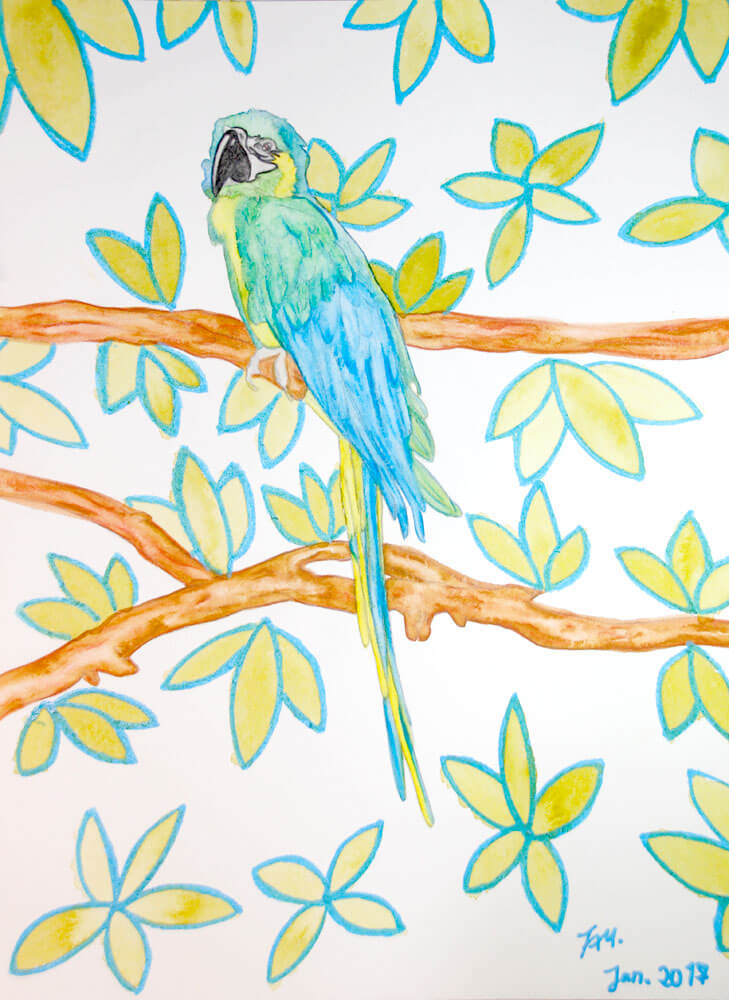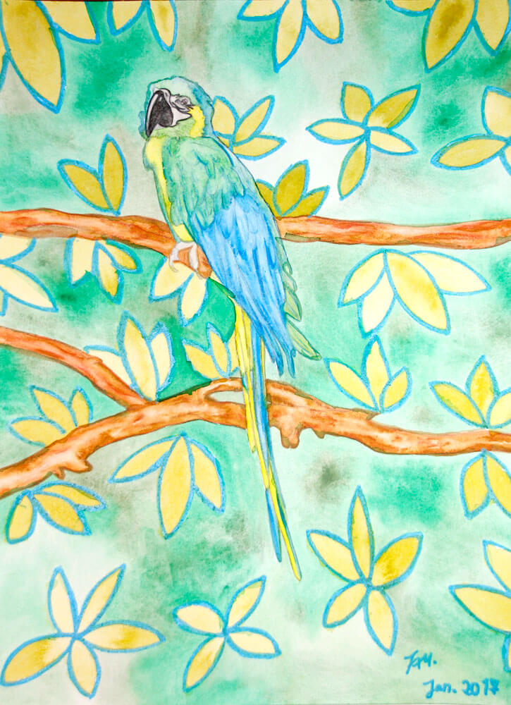 In meinem heutigen Artikel möchte ich dir die Entstehung meiner Aquarellmalerei Papagei zeigen. Mein kleiner Bruder ist seit Kurzem ein riesen Papagei-Fan und da wollte ich ihm ein passendes Bild für sein Jugendzimmer anfertigen. 😉