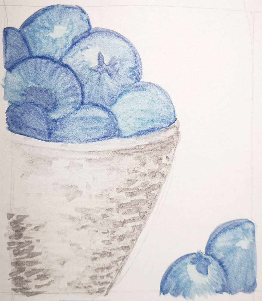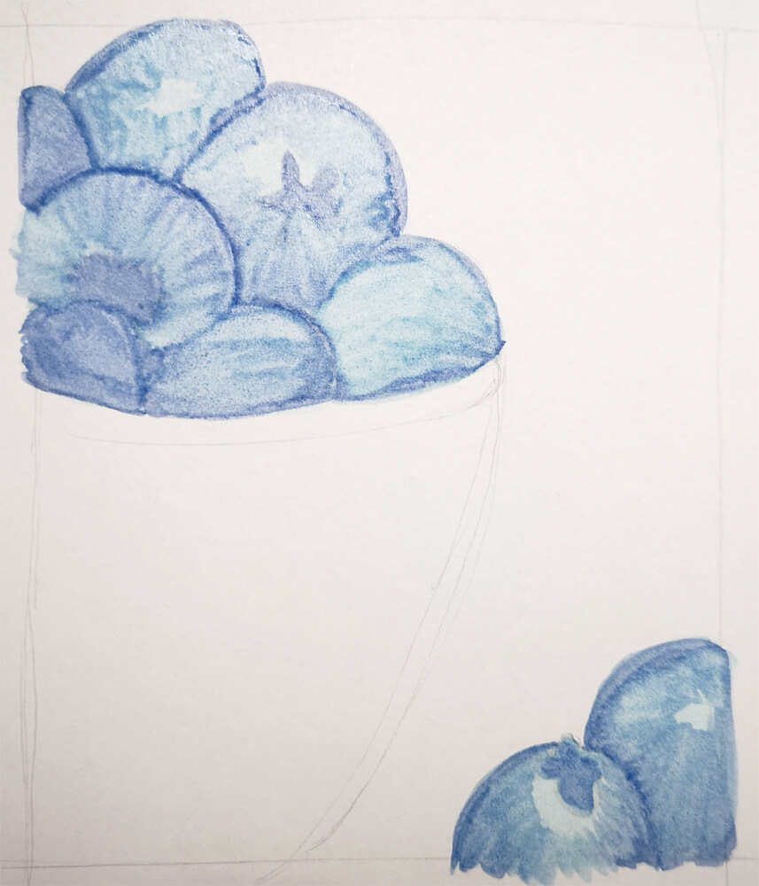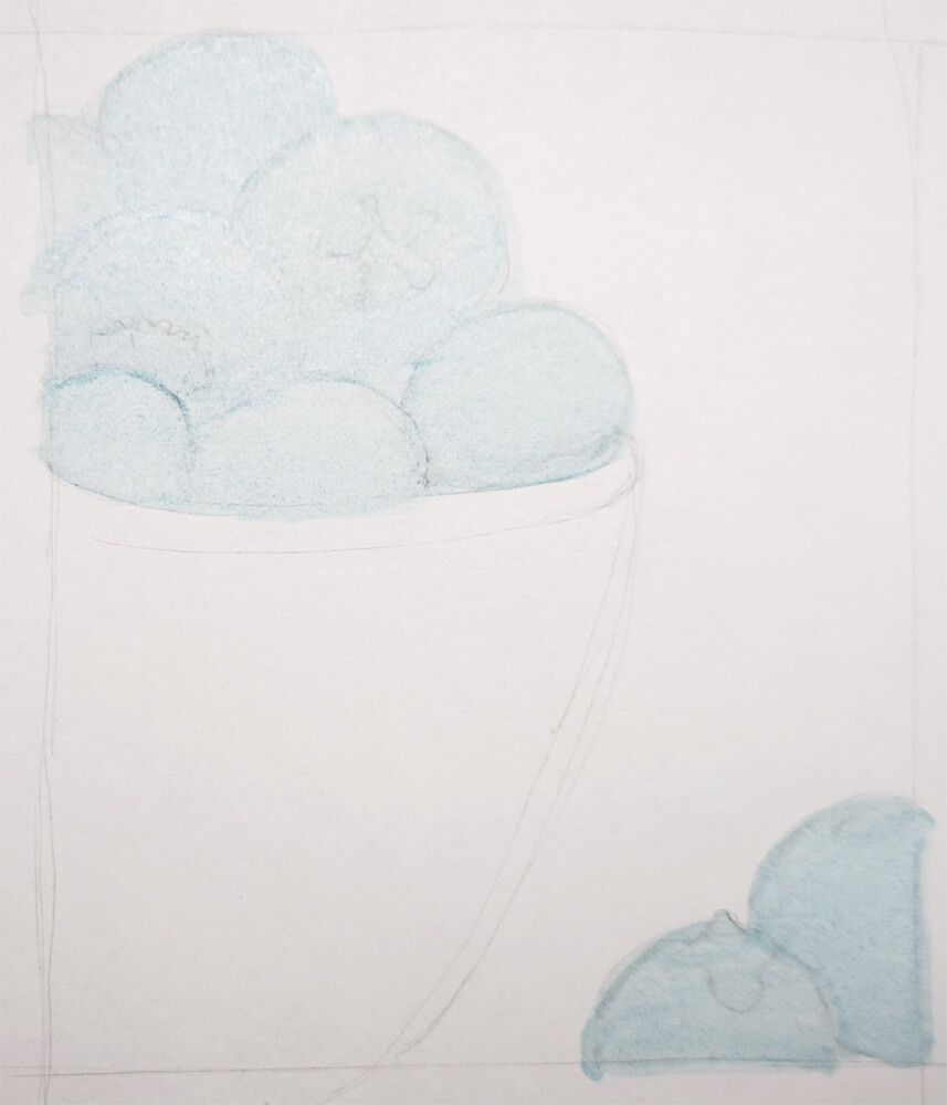 Angefangen habe ich mit einer schnellen Bleistiftskizze von der besagten Fotovorlage. Dabei habe ich mir einen kleinen Rahmen gezogen und in diesen eine Schale mit Blaubeeren sowie einigen einzelnen Beeren daneben skizziert.