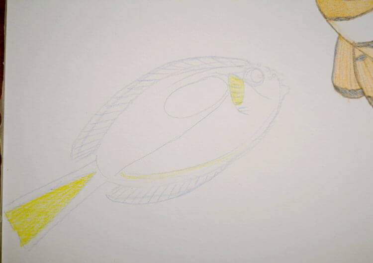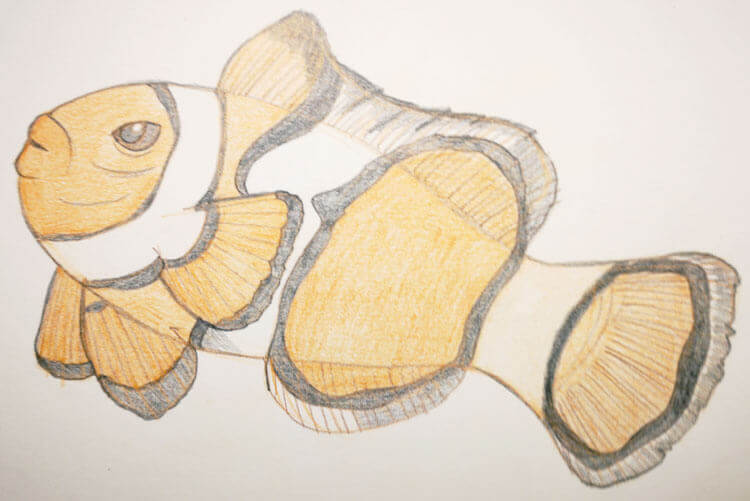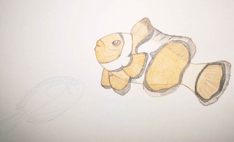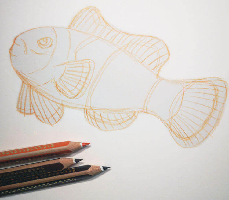 Eine klassische Skizze für das komplette Bild hatte ich diesmal nicht. Ich habe mit dem Clownfisch (auch Anemonenfisch genannt) angefangen und diesen mit dem gleichen Buntstift vorgezeichnet, mit dem ich ihn letztendlich auch gemalt habe.