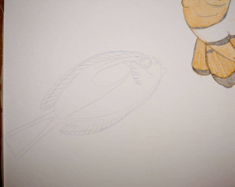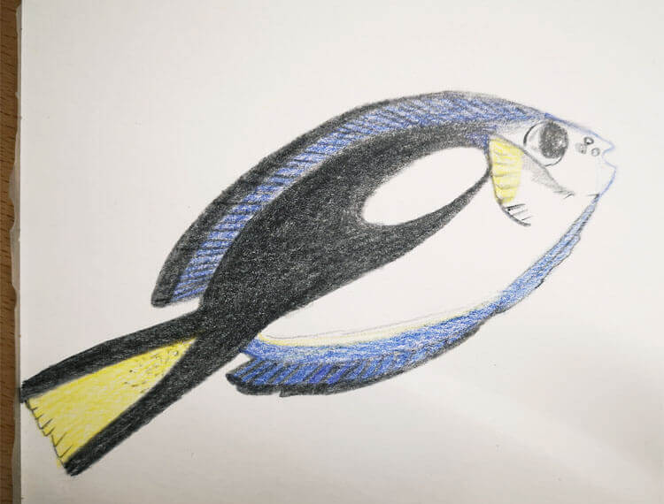 Sobald mein erster Fisch fertig war, habe ich den Doktorfisch daneben gezeichnet, sodass dieser den Clownfisch ansieht.