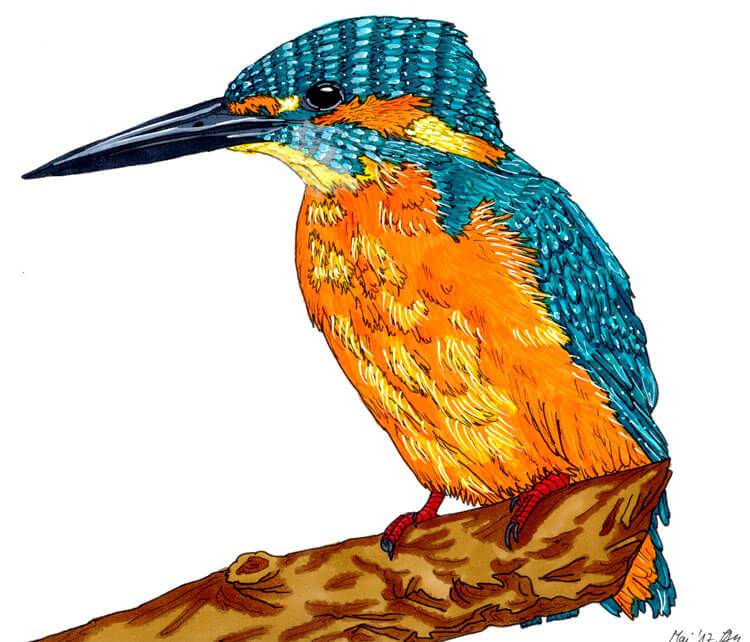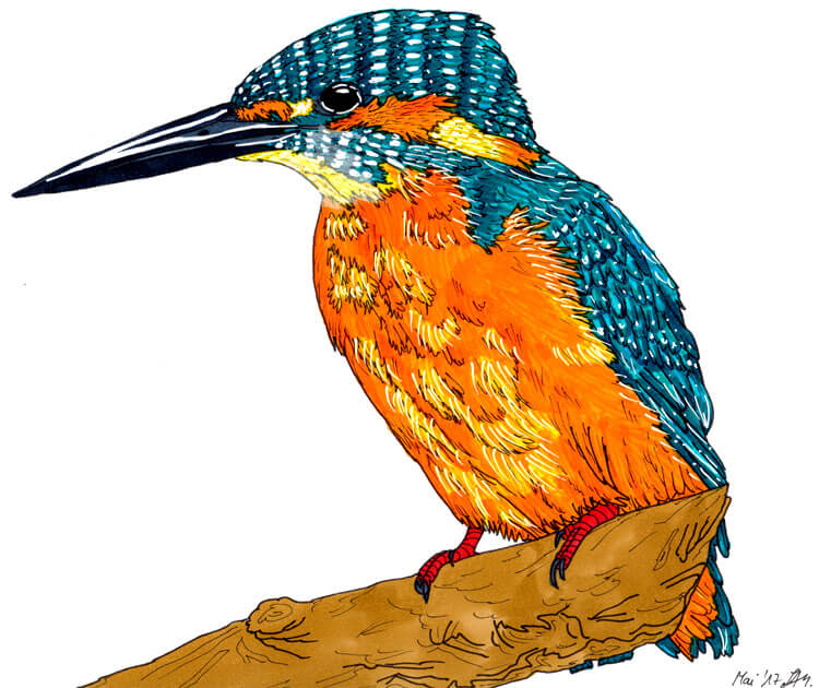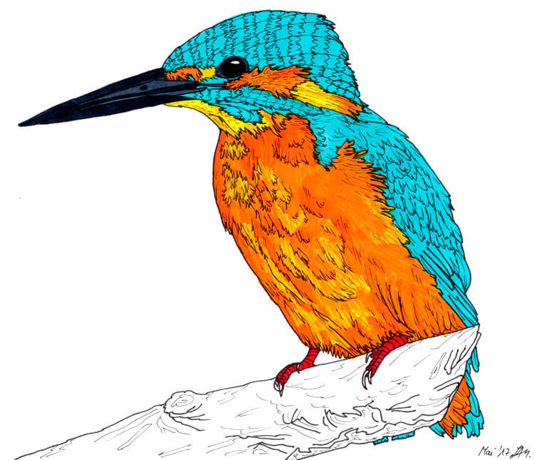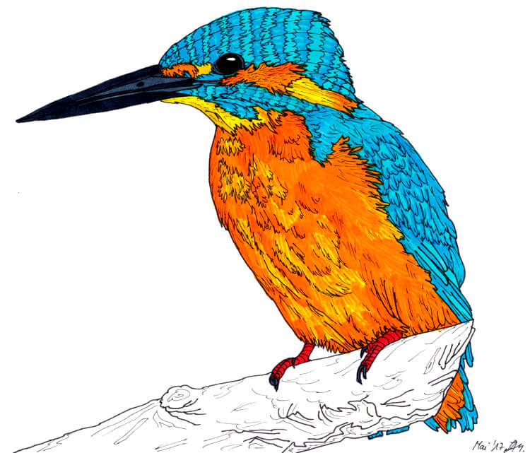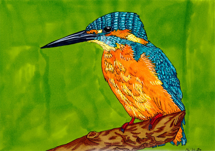 Hier zeige ich jetzt in den einzelnen Schritten wie das Eisvogel malen mit Fluxor Markern nun letztendlich bei mir ausgesehen hat. Ich hatte eine Auswahl aus 24 Farben und habe daher die besonderen Eigenschaften von Alkoholmarkern genutzt verschiedene Farbabstufungen zu erstellen, indem ich in mehreren Schichten gemalt habe.