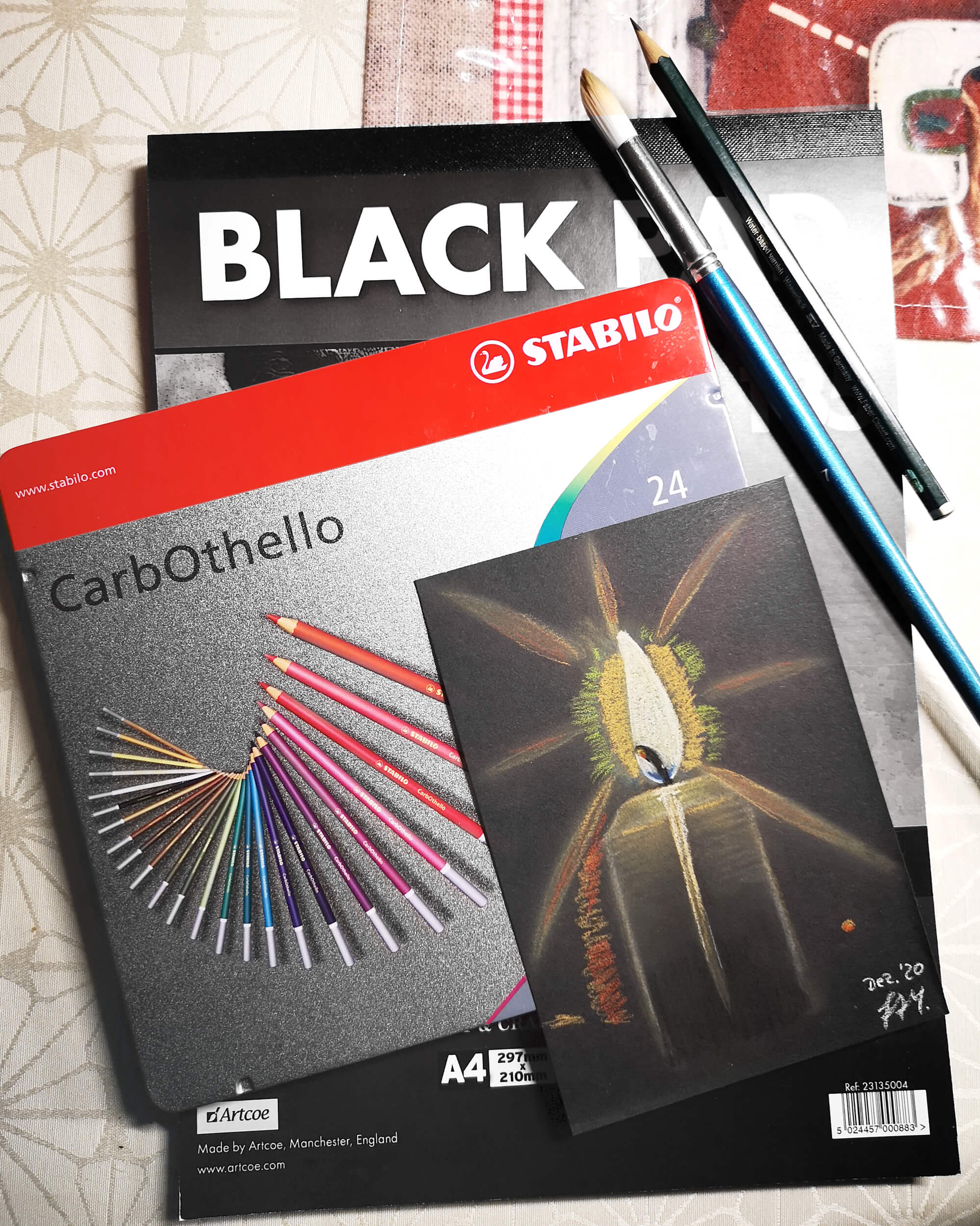 Wie oben bereits angedeutet, habe ich neben der Bleistiftzeichnung, den Buntstiften und den Finelinern auch Pastell für den Hintergrund verwendet.
