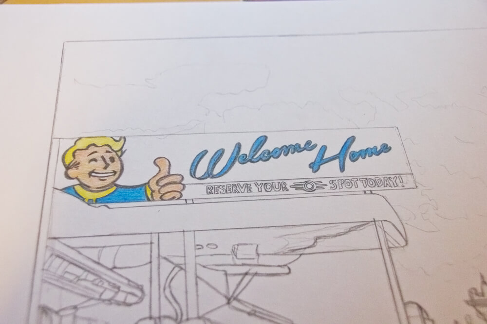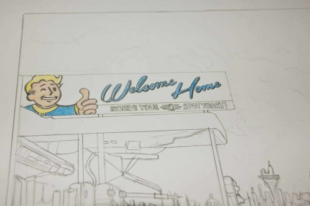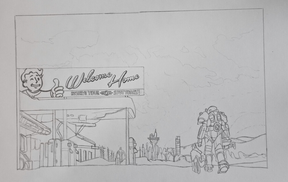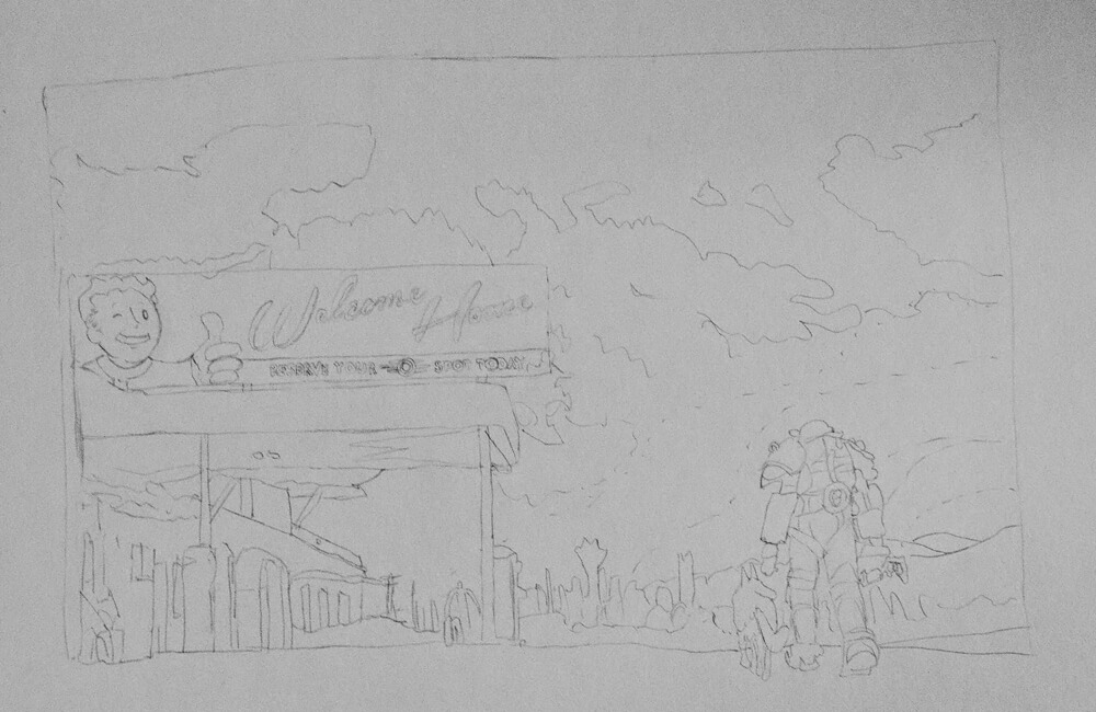 Vorlagen und Inspiration gibt es zu Fallout 4 viele, ich musste mich nur noch entscheiden und habe von meinem gewählten Motiv eine Bleistiftskizze angefertigt.