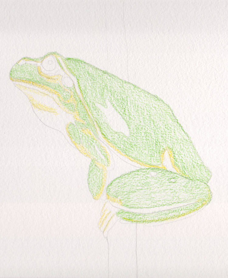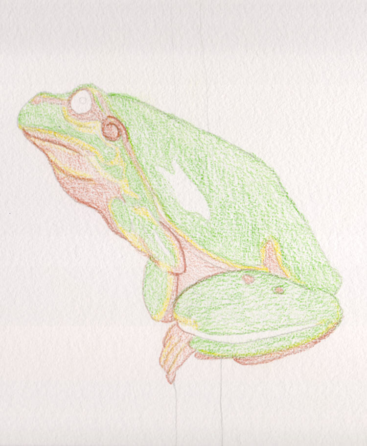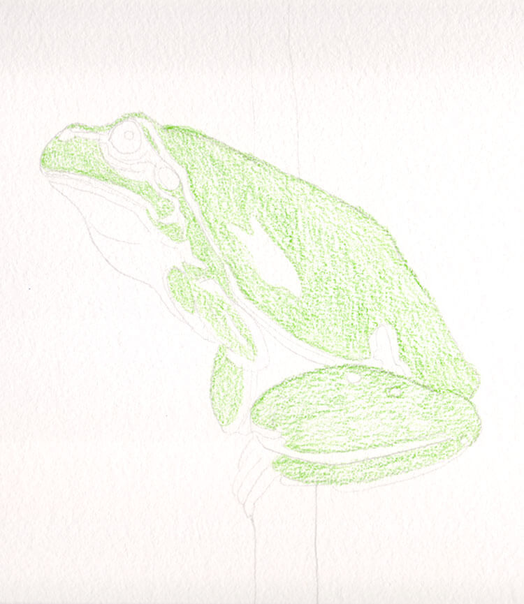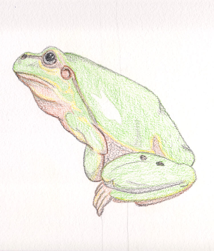 Als ich den Frosch fertig gemalt habe, habe ich ganz vorsichtig mit etwas Wasser die einzelnen Bereiche aquarelliert. Die Farben ließen sich einerseits gut ineinander vermalen und andererseits konnte ich gut einzelne Konturen stehen lassen. Das Ergebnis dieses Zwischenschrittes sieht nun wie folgt aus: