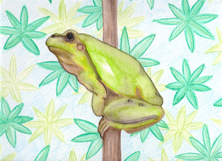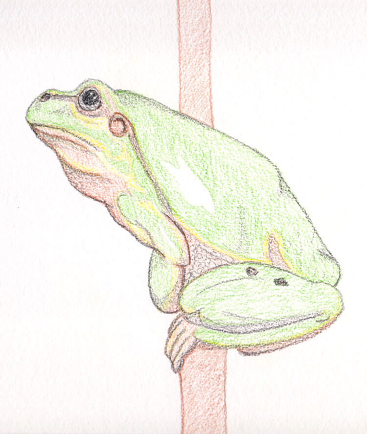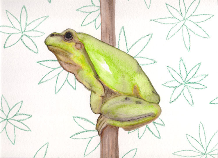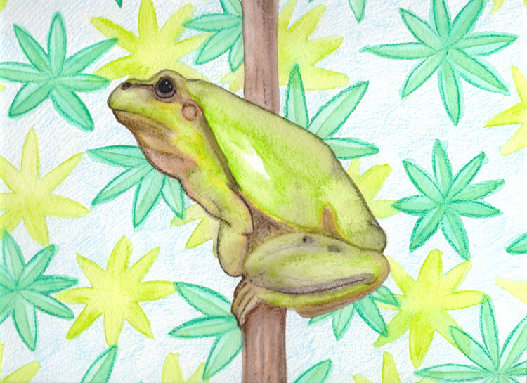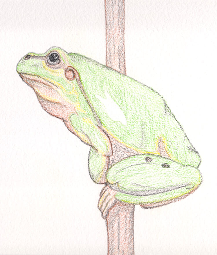 Um meine neuen Derwent Inktense Tuschebuntstifte auszuprobieren, wollte ich ein farbintensives Bild malen und habe mir daher überlegt was ich denn wohl für ein Motiv nehmen könnte. Die Wahl fiel, dank einer kurzen Vorlagenrecherche auf Pixabay, auf diesen Frosch, der auf einem Zweig sitzt.
