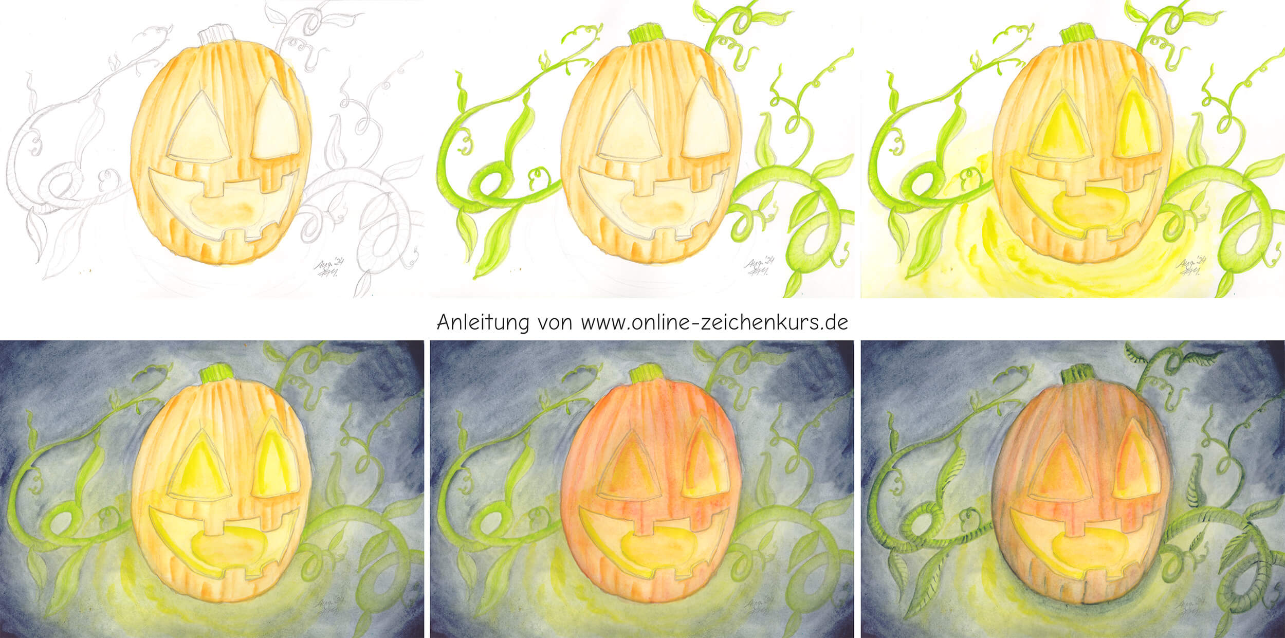 Im nächsten Schritt wird das Gesicht des Kürbisses leuchtend Gelb koloriert, um den Eindruck von innerem Licht zu erzeugen. Zuletzt wird der Hintergrund in dunklen Blautönen gestaltet, wodurch der Kürbis besonders hell strahlt und die Szene eine geheimnisvolle, nächtliche Atmosphäre bekommt.