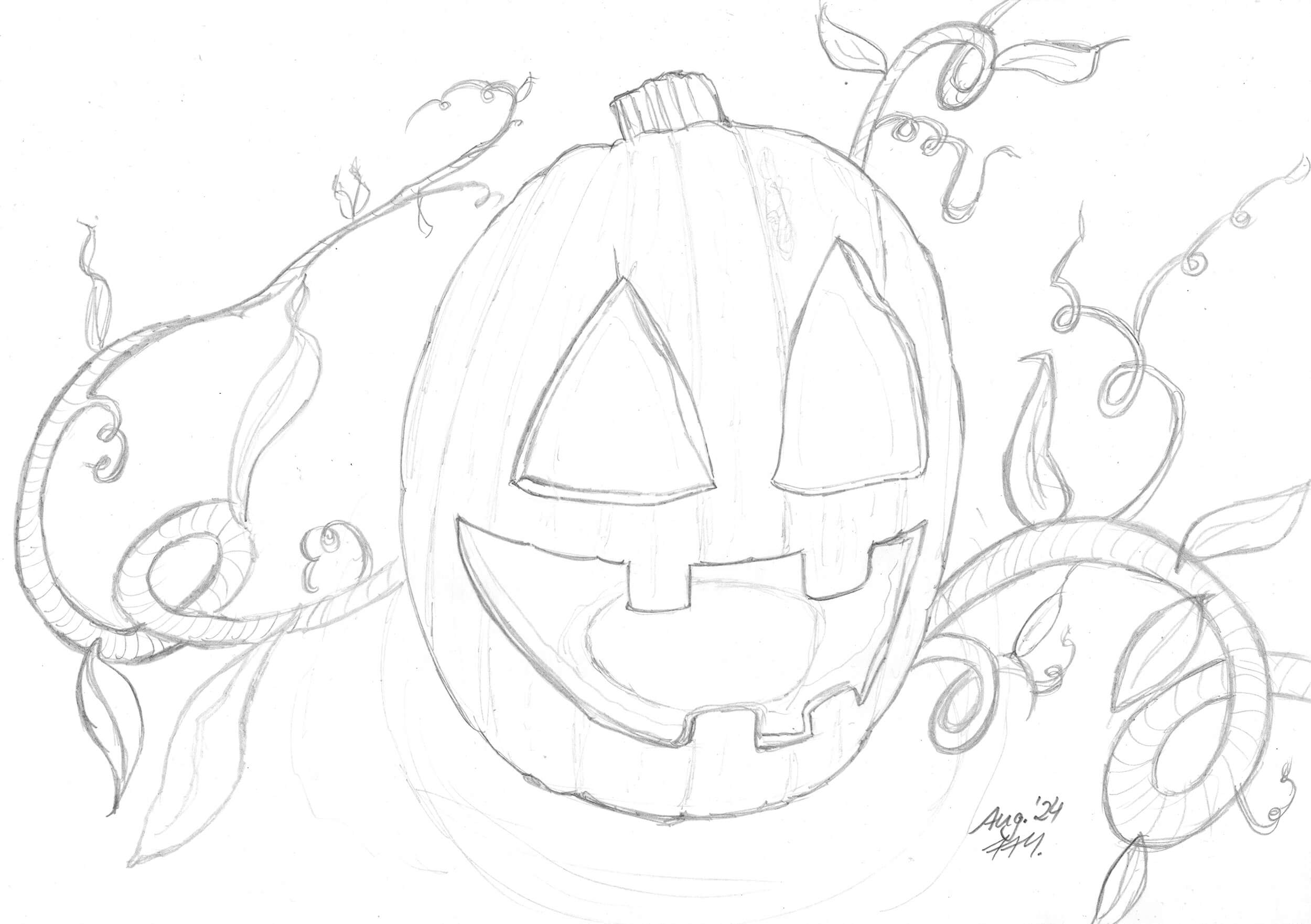 Diese detailreiche Bleistiftskizze zeigt einen klassischen Halloweenkürbis mit einem fröhlich-gruseligen Gesichtsausdruck. Die dreieckigen Augen und das breite, gezackte Lächeln verleihen ihm einen typischen Jack-O‘-Lantern-Charme.