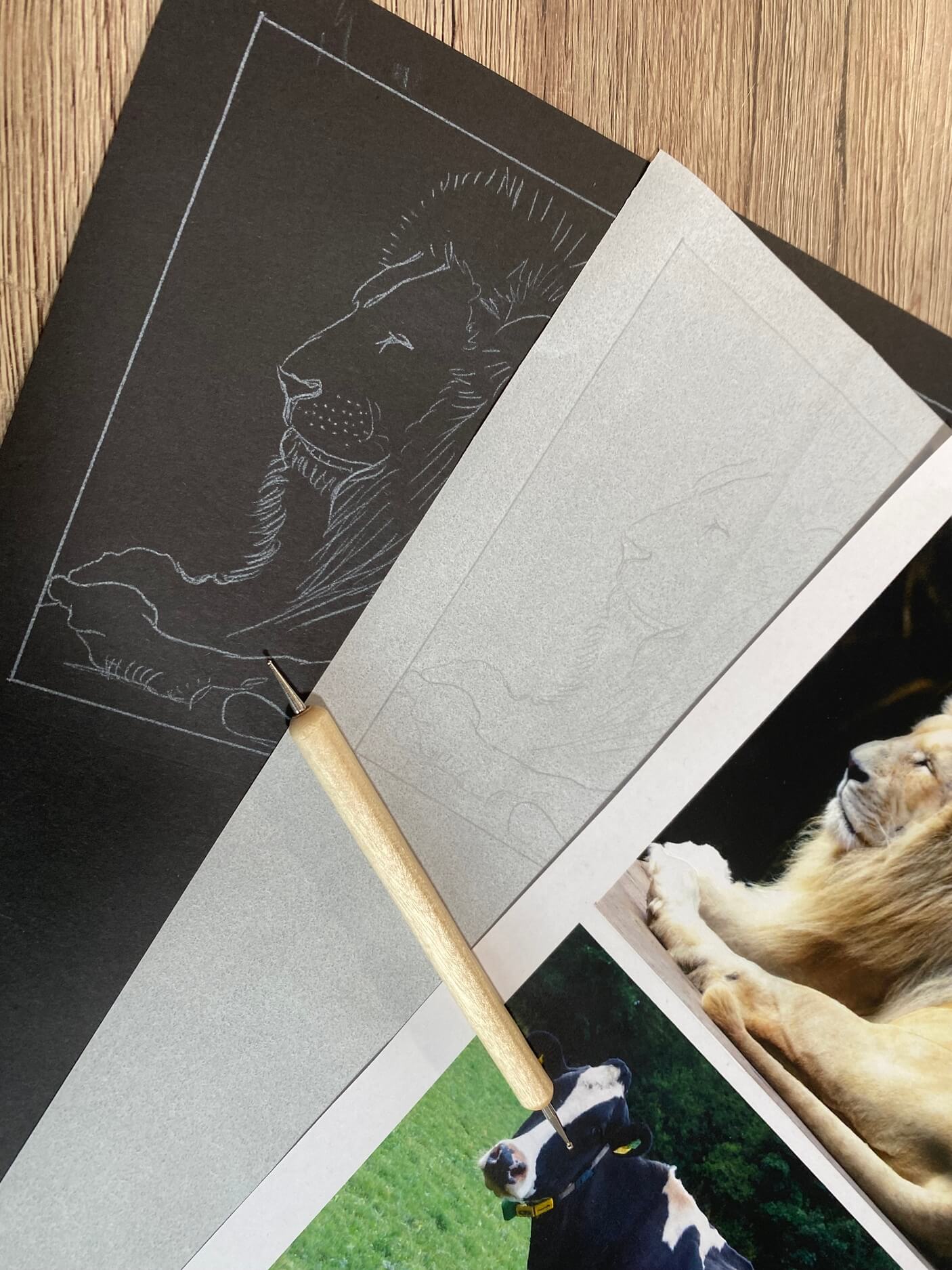 Für meine schwarze Katze auf schwarzem Papier stammt die Fotovorlage von dem Unsplash-Fotografen Anton Ponomarenko. Die Bleistiftskizze habe ich diesmal mit einem weißen Kohlepapier und einem Prägestift auf mein Zeichenpapier übertragen.