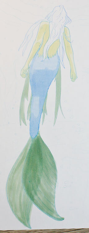 Die Hautfarbenen Partien habe ich schätzungsweise 4-5 Mal übermalt um auch Schattierungen einzuarbeiten. Mit 3-4 Schichten bin ich dann bei Fischschwanz und Schwimmflosse heran gegangen.