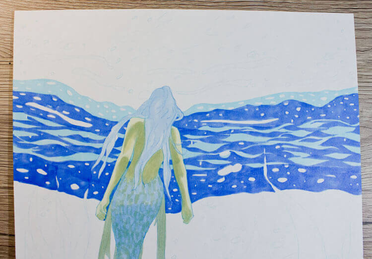 Angefangen mit meiner Markerkolorierung habe ich mit der Meerjungfrau. Dabei habe ich hier nur 3 verschiedene Farben genommen – einen Hautton, einen Blauton für den Fischschwanz und einen Grünton für die Schwimmflosse.