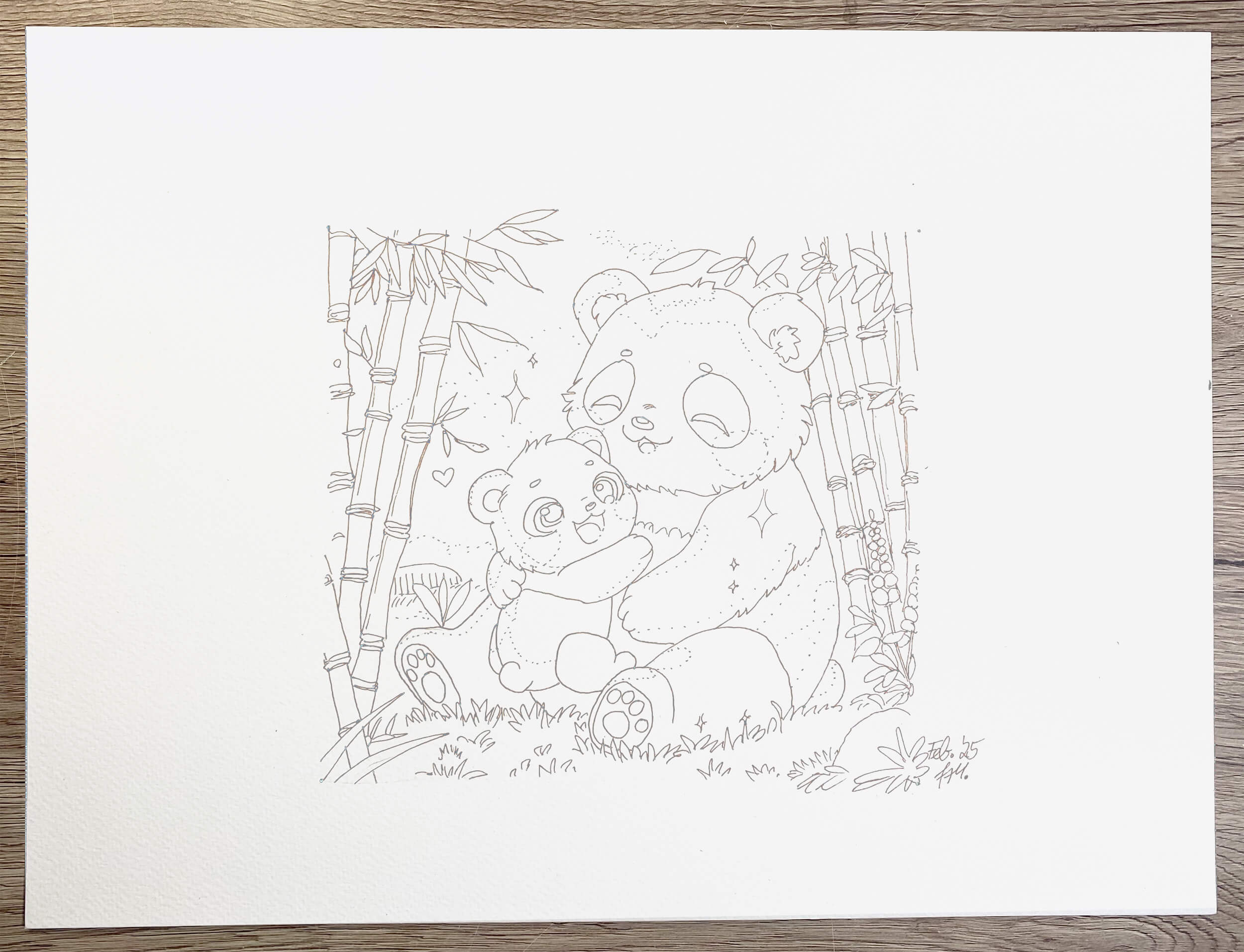 Die Skizze zeigt eine herzerwärmende Szene zwischen einem Pandababy und seiner Mama im Kawaii Manga Stil, umgeben von einer idyllischen Bambuslandschaft. Das Pandababy wirkt fröhlich und neugierig, mit großen, glänzenden Augen und einem breiten Lächeln. Details wie die zarten Bambusblätter, Gräser und kleine Herzchen verleihen der Skizze eine warme und harmonische Atmosphäre, die perfekt für ein liebevolles Aquarellmotiv geeignet ist.