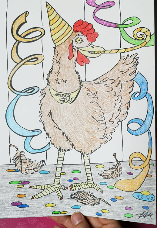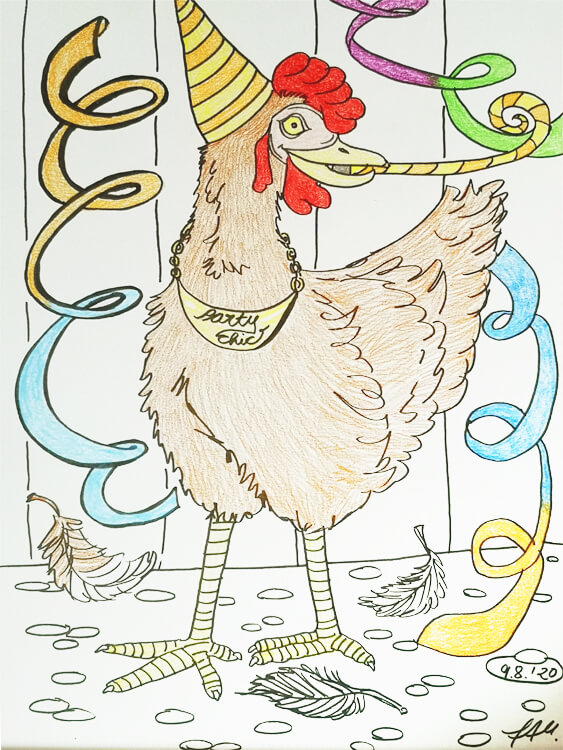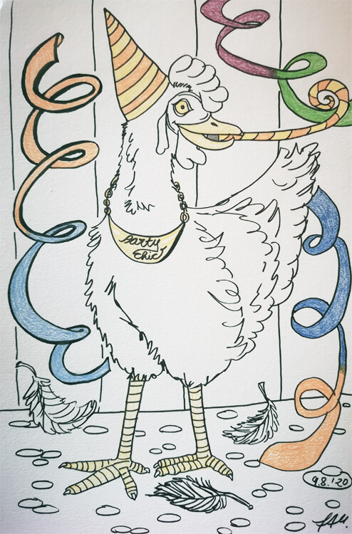 Erst habe ich grob das Huhn gezeichnet und dann kam die Party 🥳 dazu.