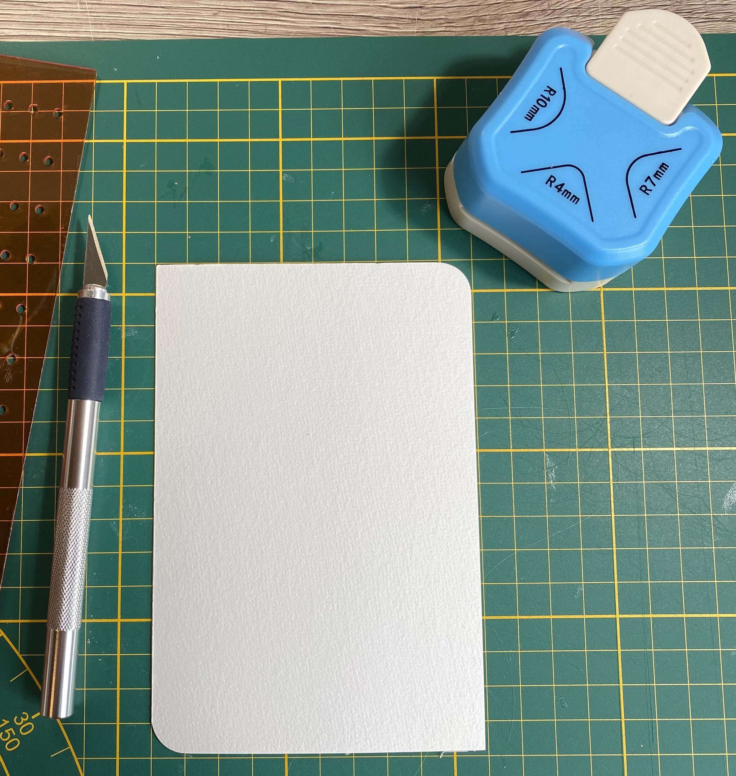 Zunächst habe ich mir mein ausgewähltes Papier zugeschnitten und die Ecken mit einer Eckstanze angepasst.