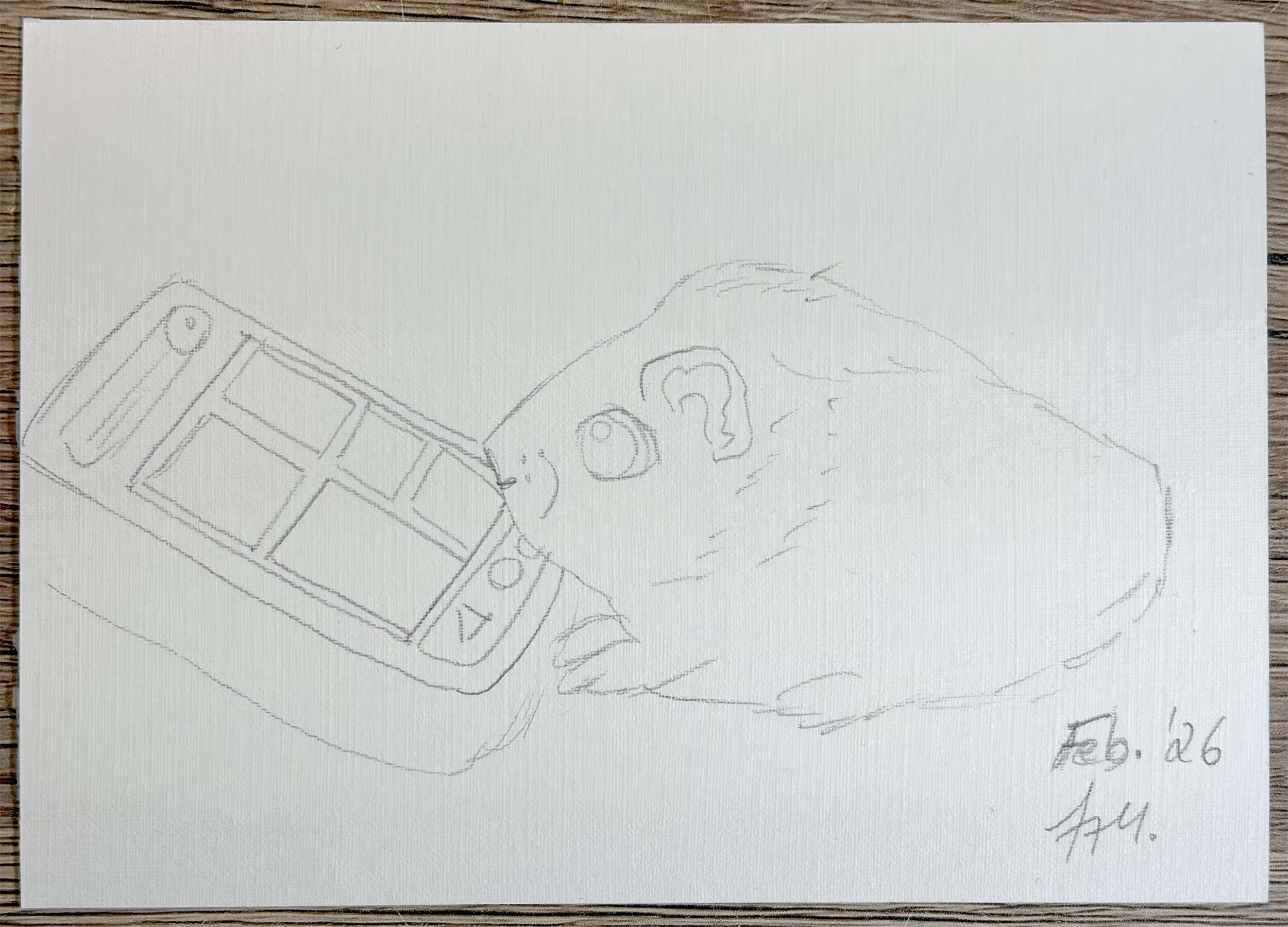 Mir war wichtig, ein persönliches Motiv zu zeigen, das Freude macht und sich gut zum Versenden eignet. Unser Meerschweinchen „Flöckchen“, das gemütlich Salat über sein Smartphone bestellt, diente mir als Inspiration. Hiervon hatte ich mir extra ein Foto erstellt. 😉