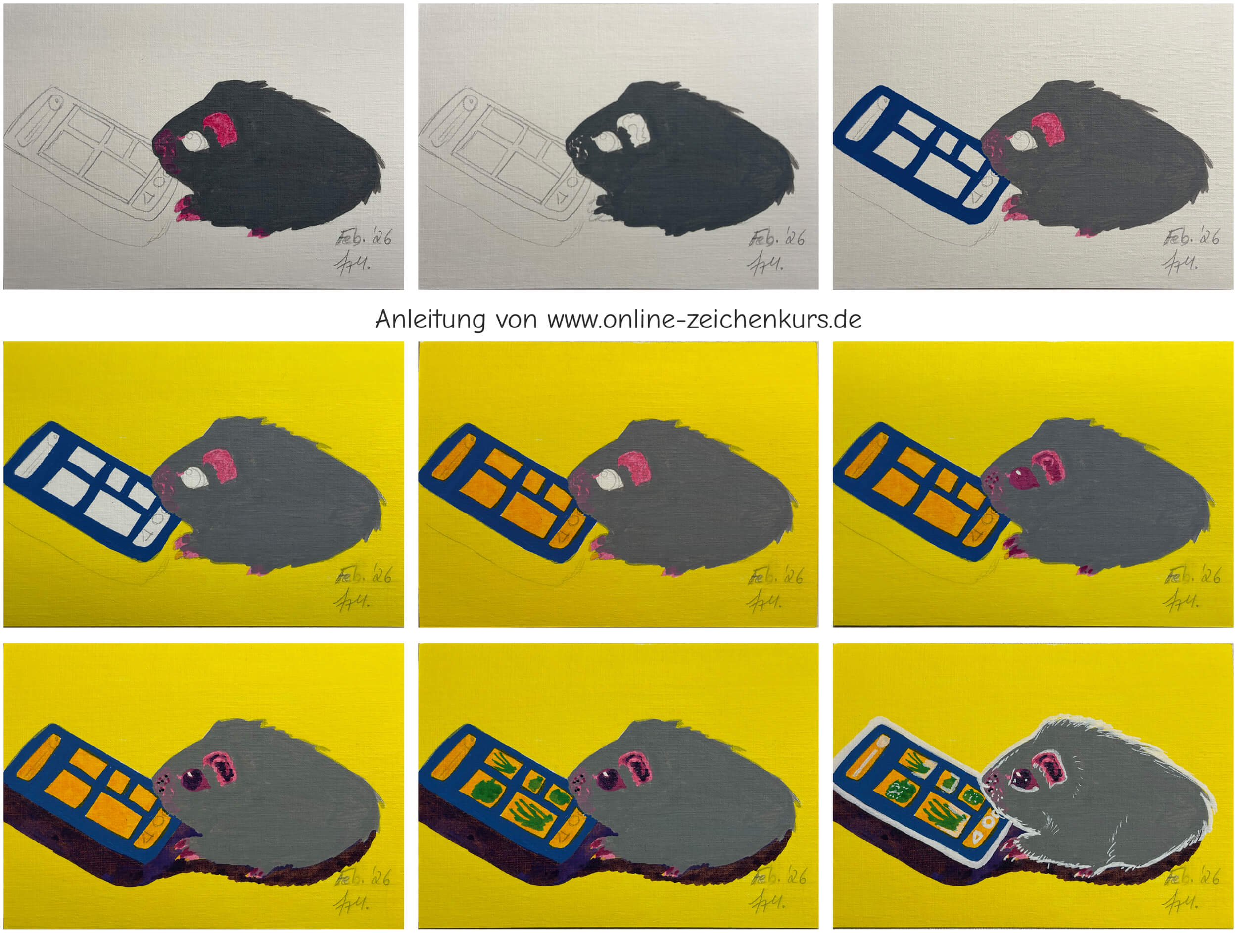 Ich habe dafür mein eigenes Meerschweinchen „Flöckchen“ fotografiert und als Vorlage genutzt. Daraus entstand eine comichafte Zeichnung, die ich Schritt für Schritt auf Postkartenpapier umgesetzt habe.