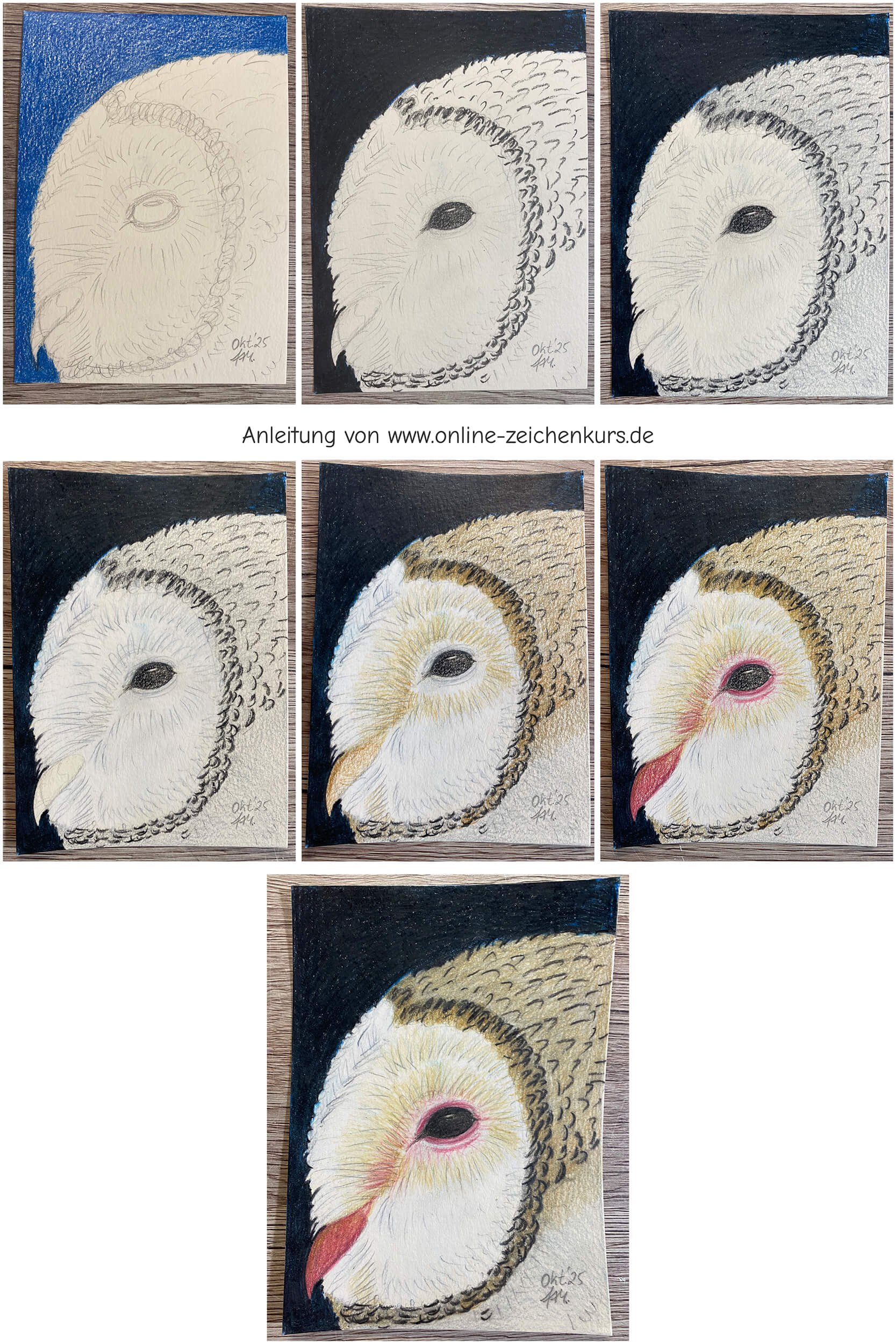 Eine Bildreihe zeigt in mehreren Schritten, wie ich eine Schleiereule mit Buntstiften koloriert habe. Von der Skizze über die ersten Schatten bis zu den fertigen Farben entsteht ein lebendiger Vogel mit feinem Federkleid und dunklem Hintergrund.