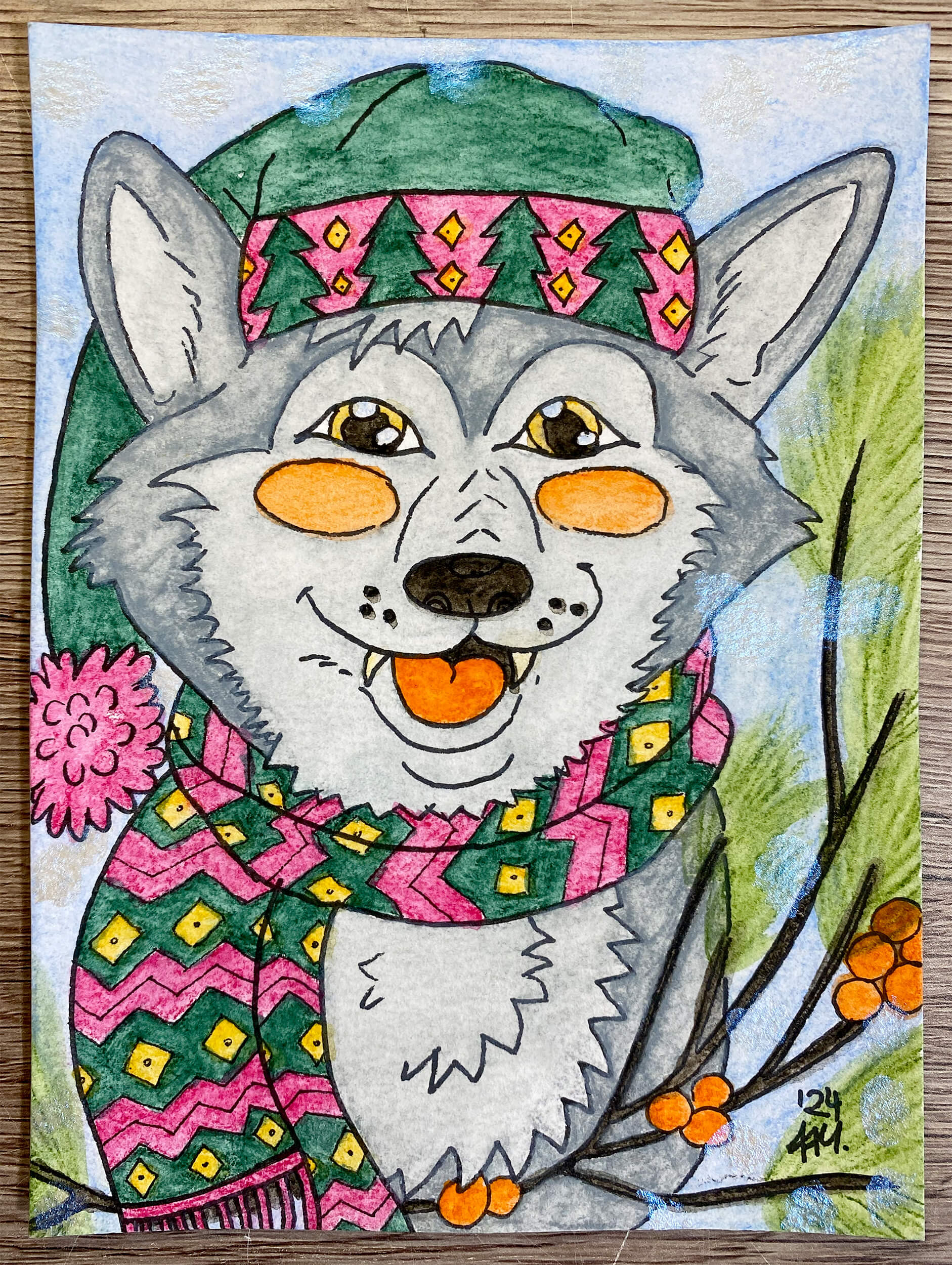 Nachdem die Umrisszeichnung steht, kolorierte ich den Wolf Schritt für Schritt mit Aquarellfarben. Ich begann mit dem grauen Fell. Danach bemalte ich die Mütze und den Schal in kräftigem Grün und Rot – die typischen Winter Komplementärfarben eben. ^^