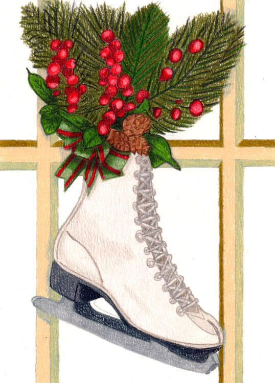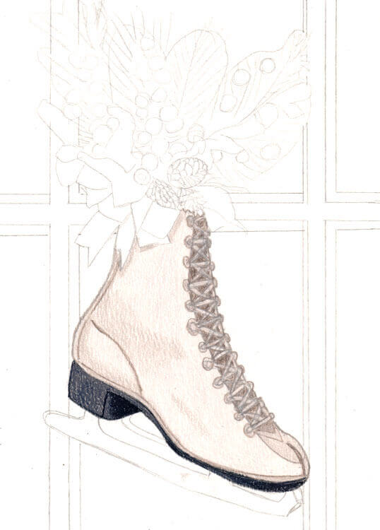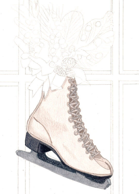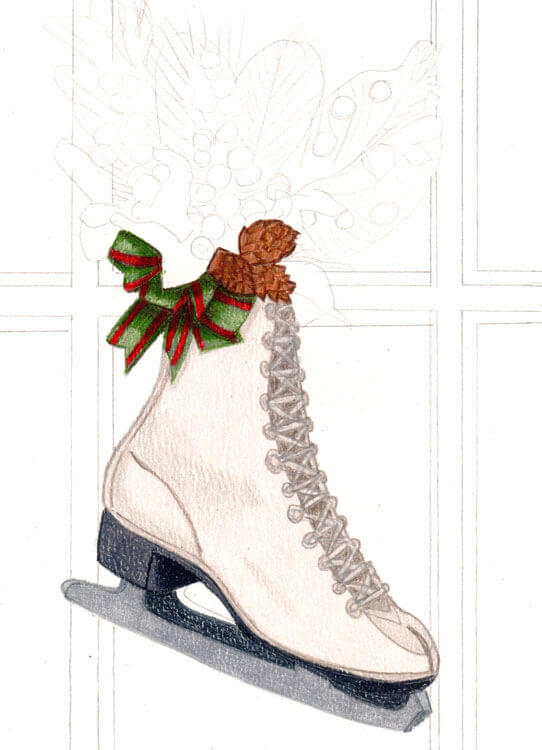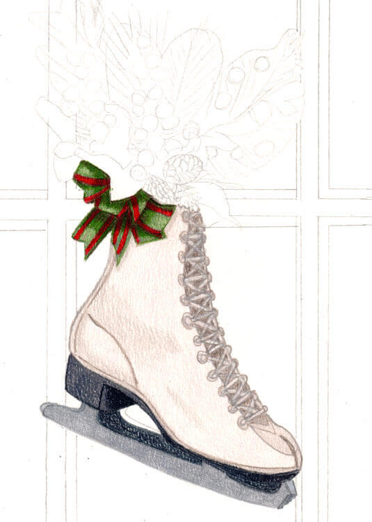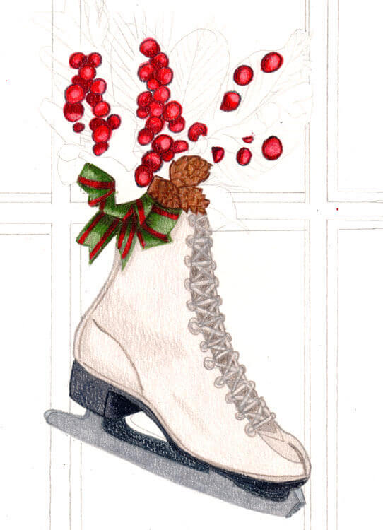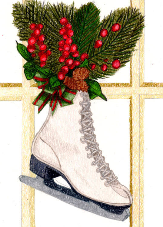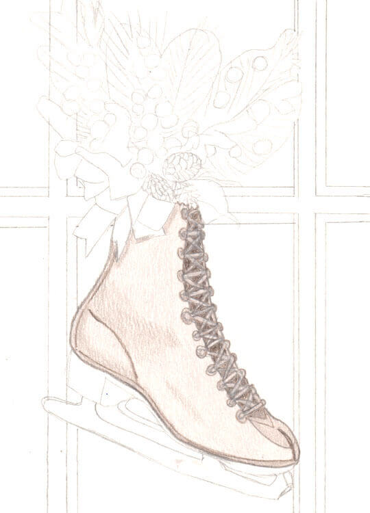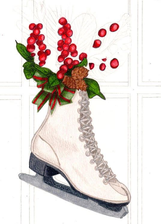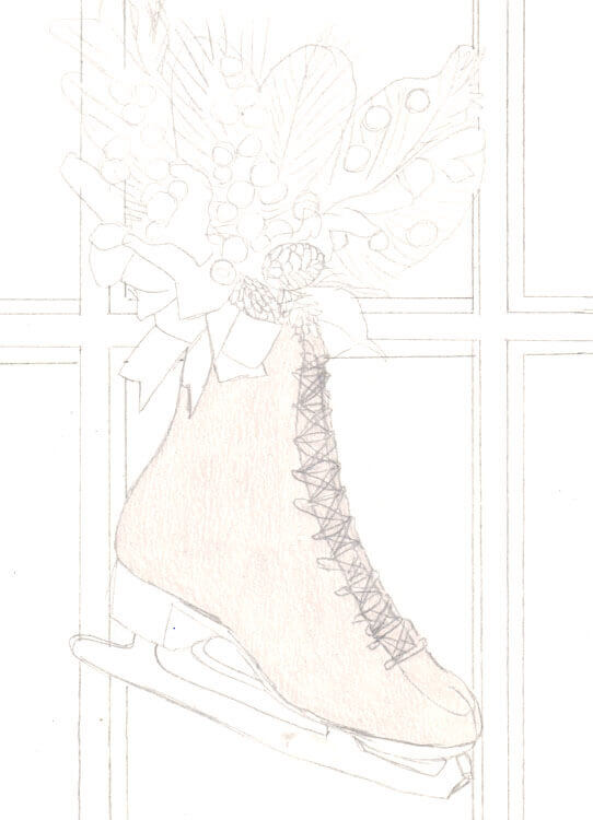 Passend zum Wichtelprojekt wollte ich auch etwas Weihnachtliches bzw. Winterliches zeichnen. Die Wahl fiel auf diesen Schlittschuh (Fotovorlage von Pixabay), der als Fensterdeko geschmückt wurde. Schlittschuhe reizen mich thematisch ohnehin und diese dekorative Idee fand ich zudem sehr schön.