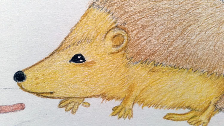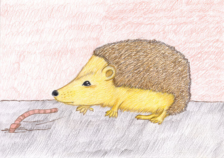 Mit verschiedenen Farbtönen der Faber-Castell Polychromos habe ich den Igel schrittweise koloriert. Den Regenwurm, die Nase und das Auge vom Igel wollte unbedingt mein Mann kolorieren (wobei ich grade noch verhindern konnte, dass der Igel rote Augen bekommt 😀 ). Damit die Kolorierung auch hier einheitlich ist, habe ich diese Stellen aber noch einmal verfeinert und drüber gemalt. ^^