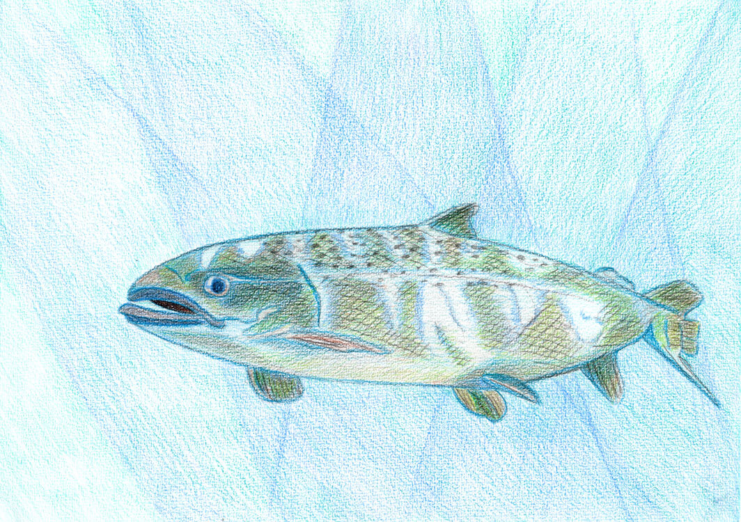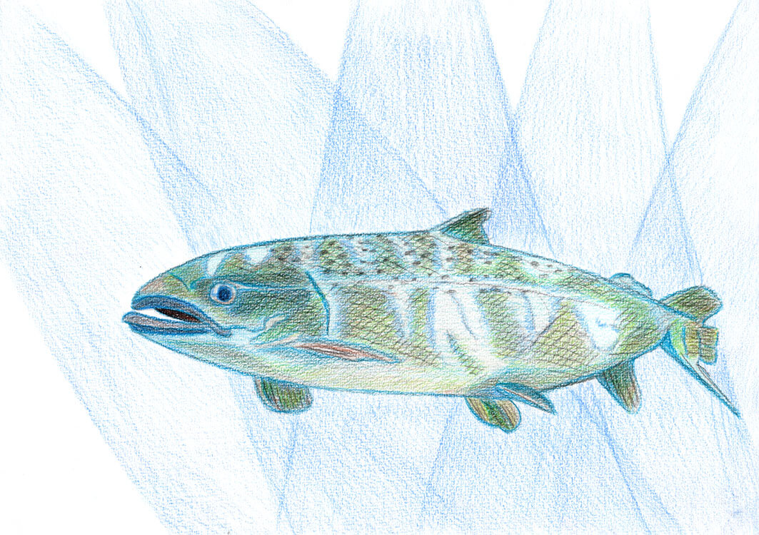 Meine Vorzeichnung habe ich in neun Schritten trocken mit verschiedenen Tönen meiner neuen Aquarellbuntstifte koloriert. Den Lachs selbst habe ich auch mit den Aquarellbuntstiften gemalt, da ich mir zu Anfang alle Möglichkeiten offen halten wollte.