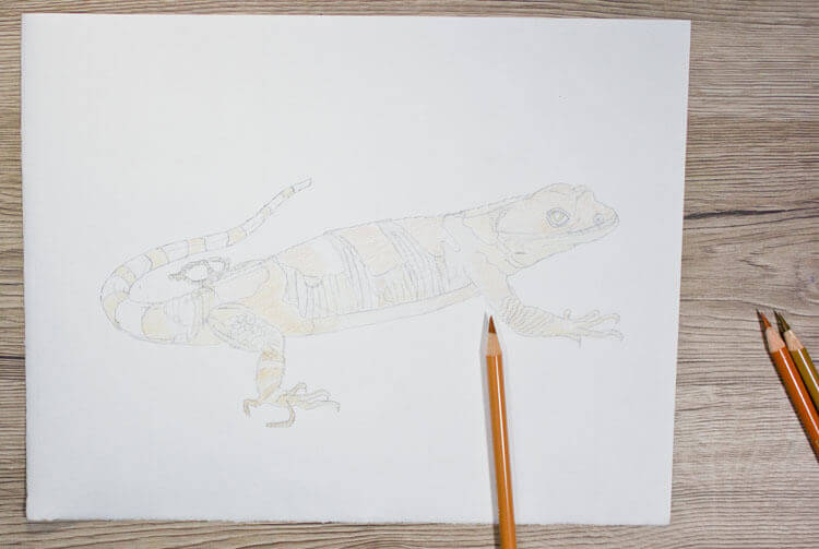 Ich habe mir vorab ein paar Buntstiftfarben genommen, mit denen ich mein Bild kolorieren wollte. Zuerst habe ich eher schwach aufgedrückt und meine Flächen grob vorgrundiert (Schritt 1 und 2). Als nächstes habe ich etwas Strucktur auf die Eidechse gebracht (Schritt 3) und dann in den noch einmal die Farben kräftiger betont (Schritt 4). Zuletzt habe ich die bereits angedeuteten Strukturen noch deutlicher heraus gearbeitet (Schritt 5).