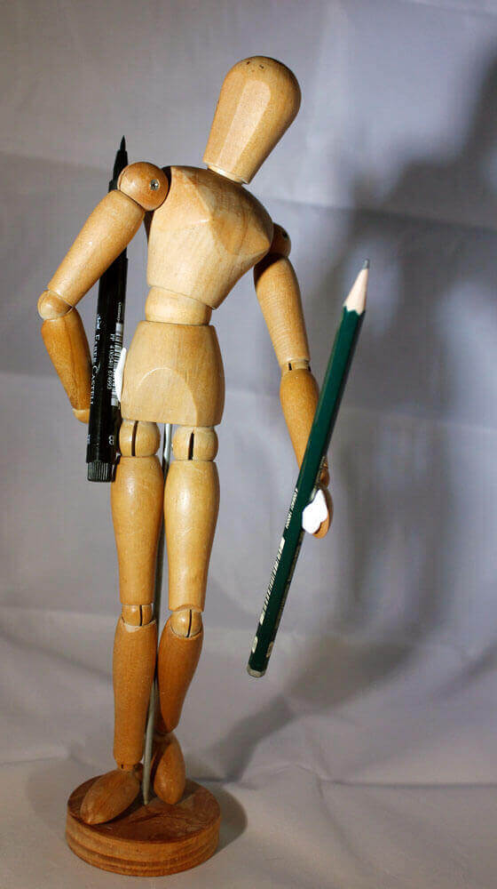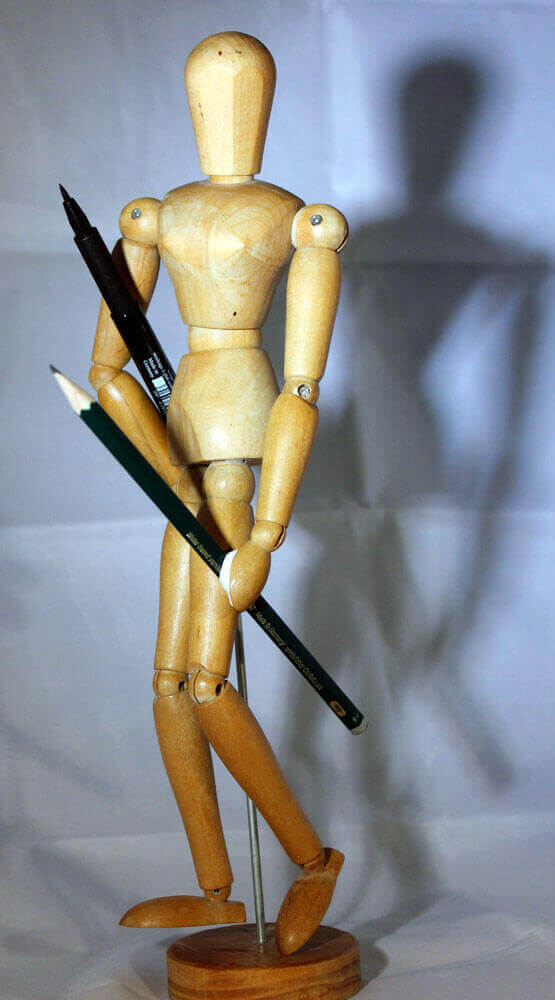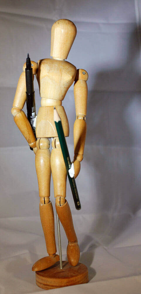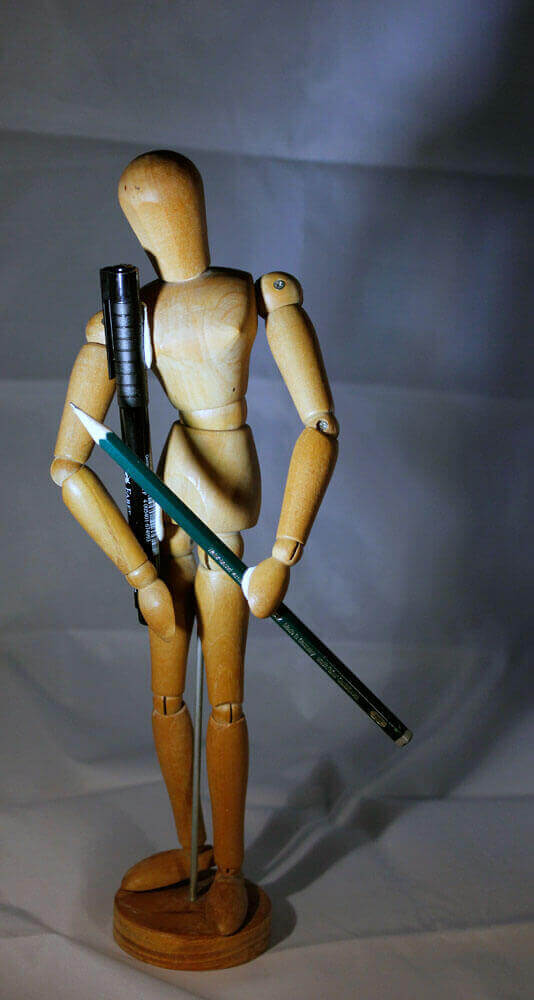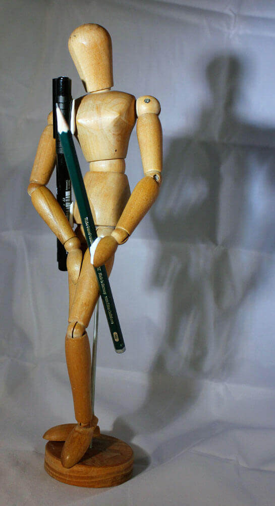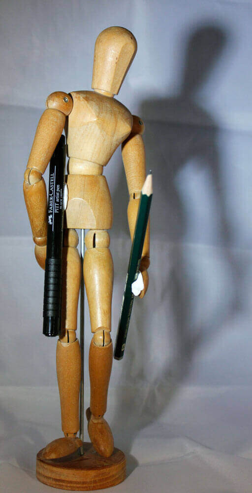 Die Zeichenvorlagen in diesem Artikel sind verschiedene Fotos von meiner Gliederpuppe, an die ich mit Klebeknete zwei Stifte angebracht habe. Die Puppe habe ich vor einiger Zeit aus verschiedenen Perspektiven aufgenommen und bin bislang noch gar nicht richtig dazu gekommen diese Fotos sinnvoll zu verwerten. Ich habe sie auf der Suche in meinem Fotoportfolio nach passenden Zeichenvorlagen nun wieder gefunden und dachte mir, das sei die perfekte Gelegenheit diesen Fotos doch noch zu einem sinnvollen Nutzen zu verhelfen.