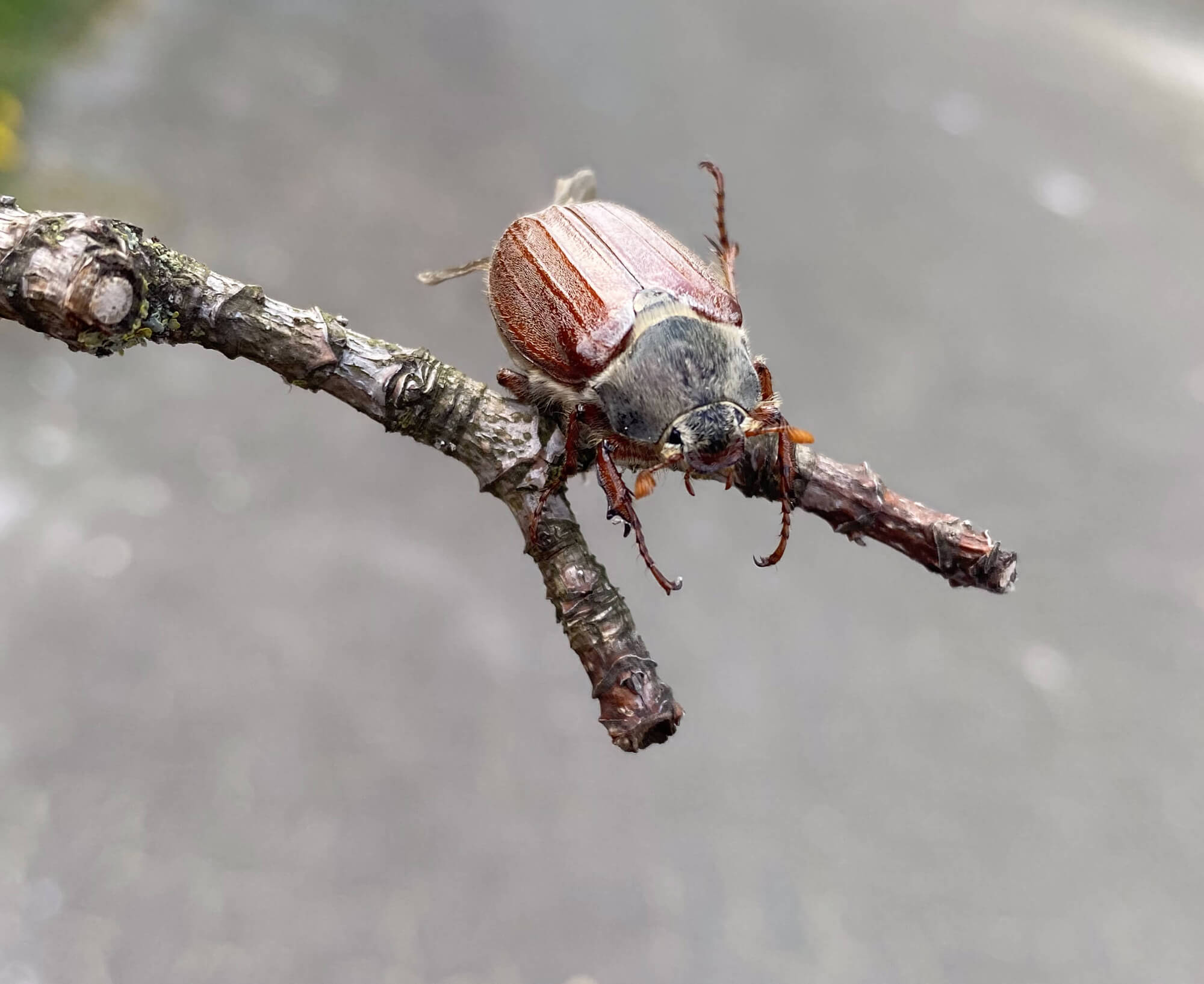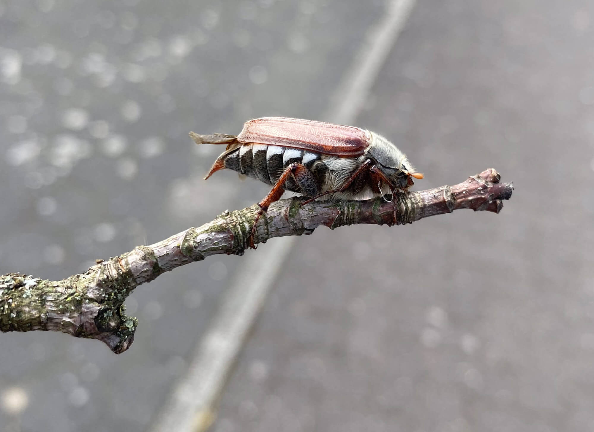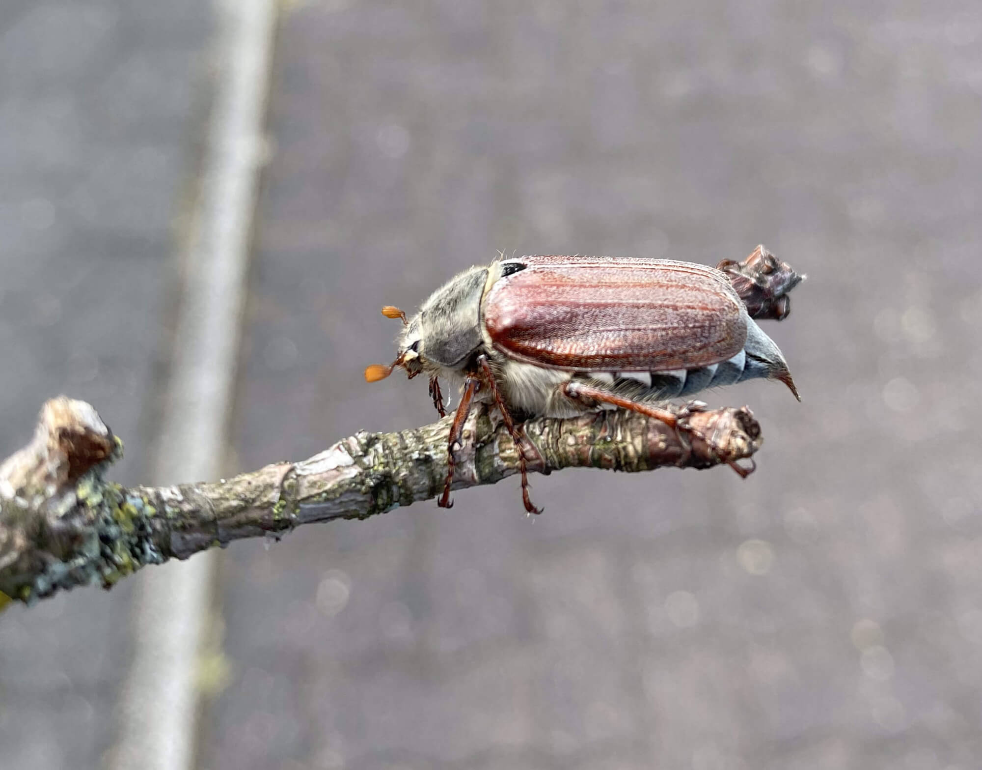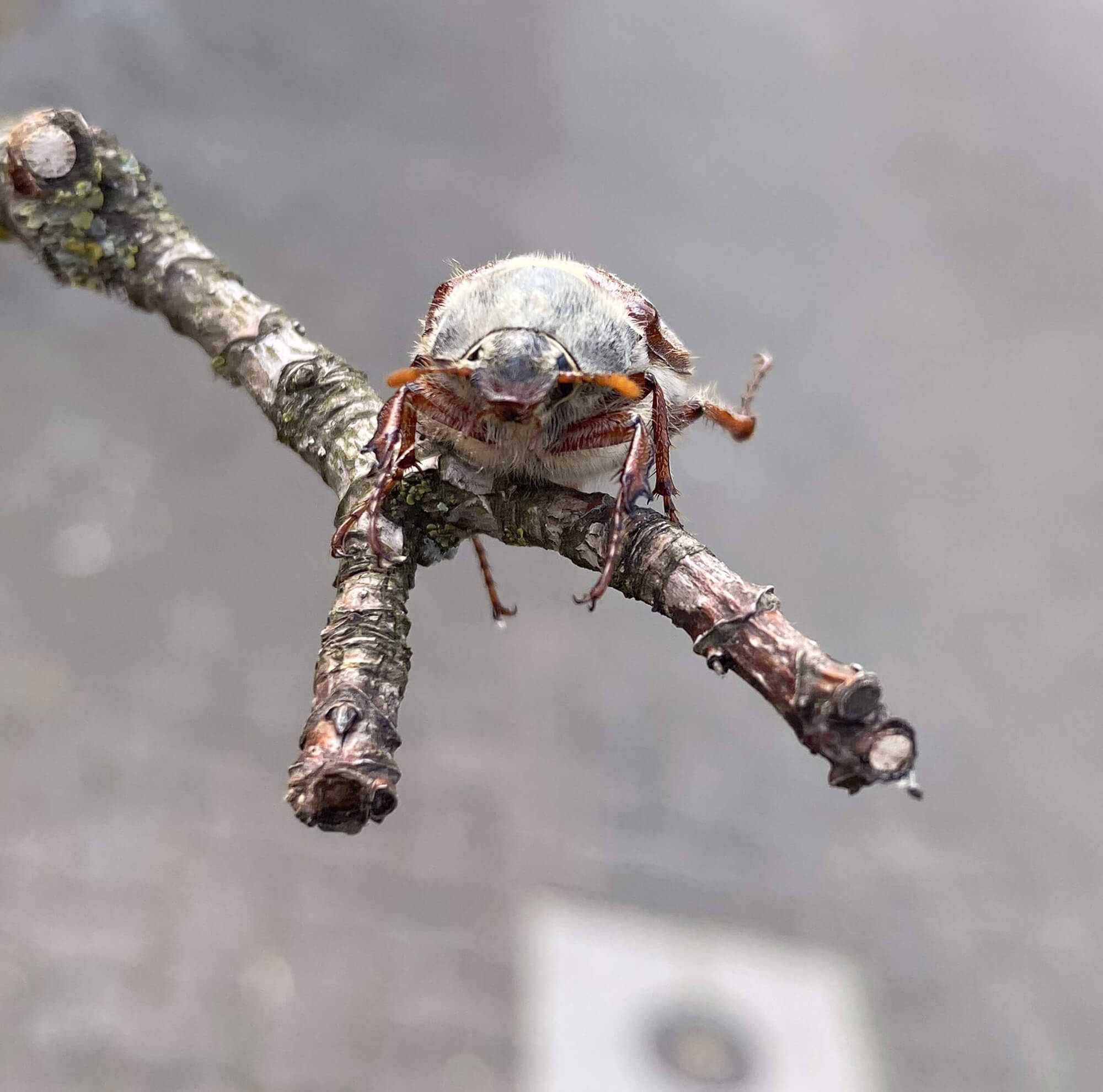 Der kleine Maikäfer krabbelte mir quasi beim Spazierengehen über den Weg und ich habe ihn kurzerhand mit einem Stöckchen aufgesammelt um ihn meiner Tochter zu zeigen. Der kleine Akrobat hat sich tapfer darauf gehalten: