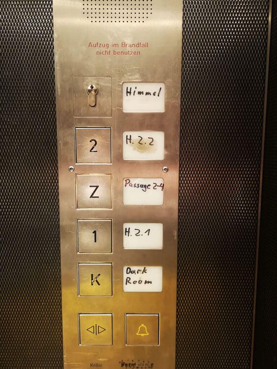 Da wir mit Kinderwagen unterwegs waren, mussten wir den Fahrstuhl nehmen. Ein wirklich luxeriöses Exemplar. Wenn man nur wüsste, in welche Etage man muss! Ganz oben war jedenfalls nicht richtig…