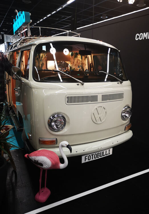 Relativ am Anfang unserer Entdeckungstour fanden wir in Halle 2.2 (gegenüber von Huawei) den Fotobulli. Hier war natürlich warten und anstellen gefragt. Aber es hat sich gelohnt. Denn bei dem Fotobulli handelt es sich um eine Photobooth (wie die Fotoautomaten für Passfotos) in einem alten VW Bulli. Man kann sich alleine oder zu mehreren hinten rein setzen, mit verschiedenen Accessoires (Hüte, riesiger Donut, Brille und so ein Kram) ausstatten und los geht’s! Vier Bilder werden dann gemacht, die dann im Anschluss ganz klassisch in doppelter Ausführung auf einer kleinen Banderole gedruckt ausgespuckt wurden. Zur Krönung kann man sich seine Fotos im Anschluss noch per Mail zusenden lassen. Das war echt ein Highlight und zudem kostenlos!