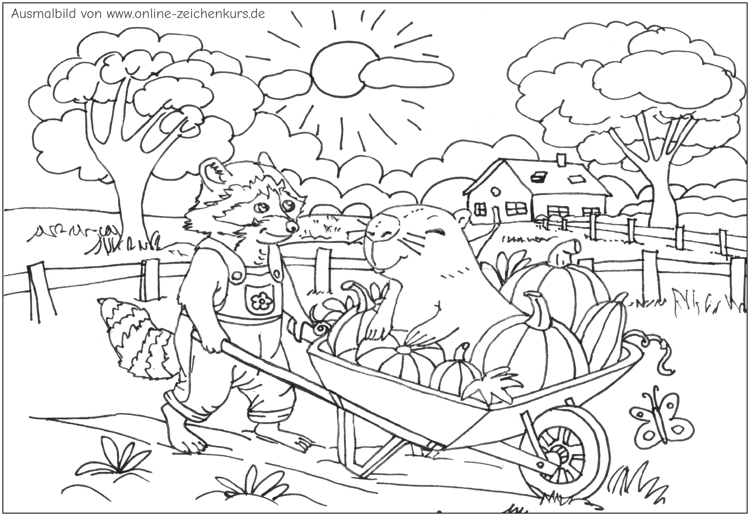 In diesem liebevoll gezeichneten Ausmalbild siehst du eine fröhliche Szene auf einem Bauernhof. Ein Waschbär in Latzhose schiebt eine Schubkarre voller Kürbisse durch die sonnige Landschaft.