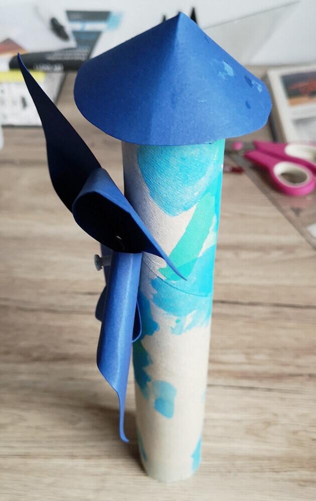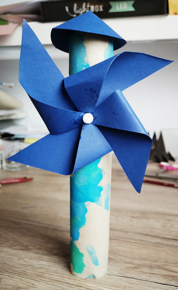 Zum Schluss klebst du das Dach oben an die Pappröhre und befestigst das Windrad mit der Pinnadel am Schaft der Röhre. Die Anleitung sah vor, dass der Korken im Inneren der Röhre als Gegenstück zur Pinnadel angebracht wird. Da ich, wie gesagt, keinen Korken habe und auch den Knetradierer irgendwann wieder benutzen wollte, habe ich das Ganze wiederum festgeklebt. So dreht es sich zwar leider nicht, aber es hält. 😰