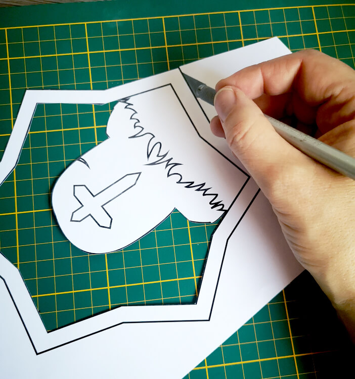 Ich habe zum Ausschneiden ein Skalpell genommen, da ich damit am besten zurecht komme und kleinere Details ausschneiden kann. Wer kein Skalpell hat, kann zur Not auch eine Nagelschere nehmen, damit kommt man auch noch gut in die kleinen Ecken und um die Kurven.
