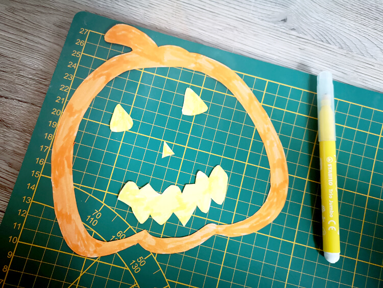 Angemalt habe ich es jetzt mit Filzstift, es geht aber natürlich auch jede andere Farbe wie Buntstift oder Plakatfarbe. Natürlich muss das ausgeschnittene Motiv von beiden (!) Seiten ausgemalt werden.