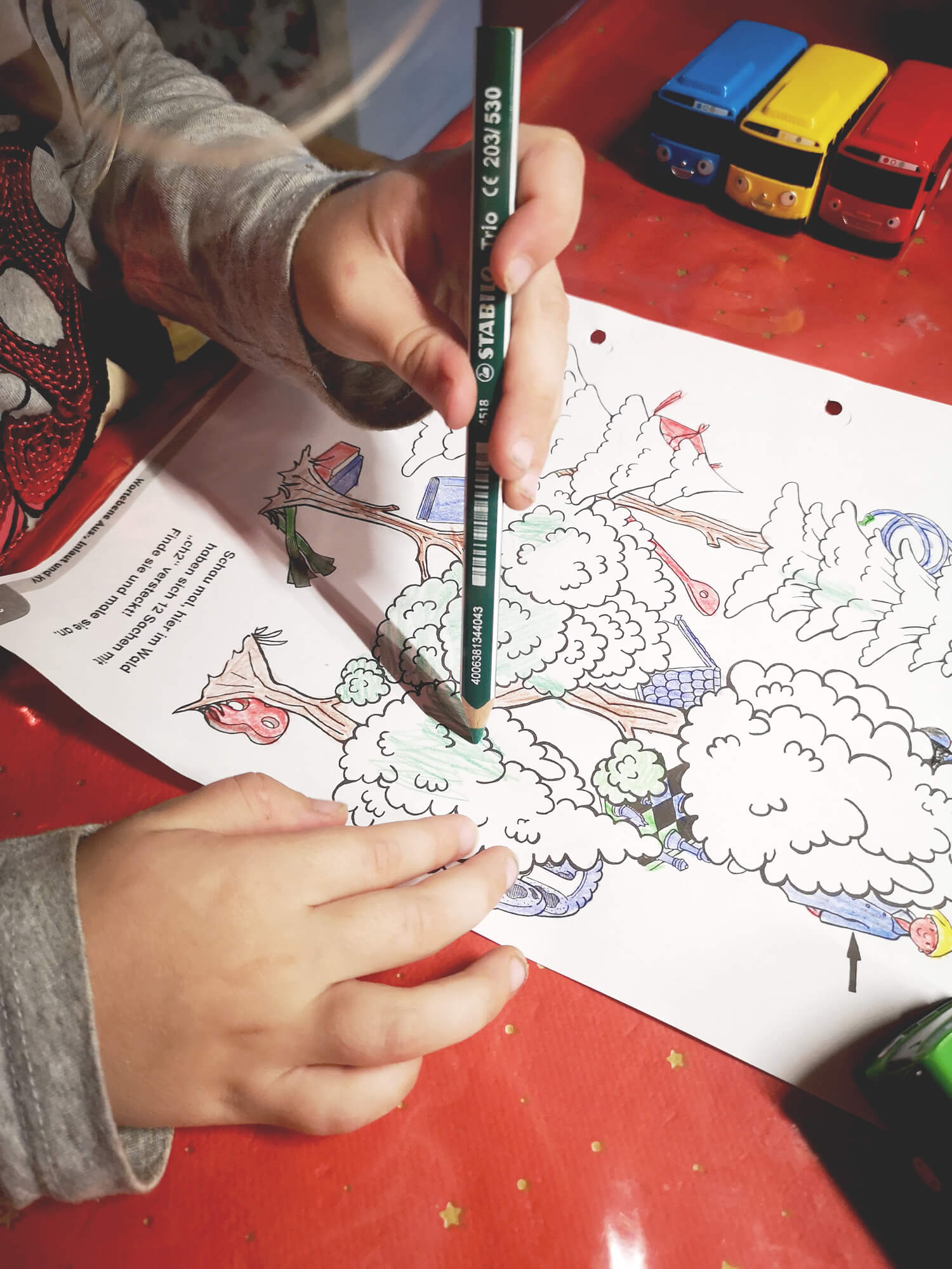 Doch während sie so am Malen war, fiel mir auf, dass ihre Linien sehr dünn und weniger flächig waren, was grade beim Ausmalen ja nicht der Sinn der Sache ist. Verursacht wurde dies, durch ihre steile Stifthaltung, sie hat den Stift also fast grade gehalten.