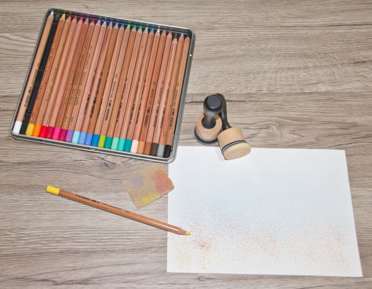 Das habe ich für meinen Artikel gleich mal ausprobiert. Aber statt einem Estompen habe ich für mein Beispiel ein Mini Ink Blending Tool* von Ranger verwendet. Und statt Buntstift habe ich es mit einem Pastellstift ausprobiert.