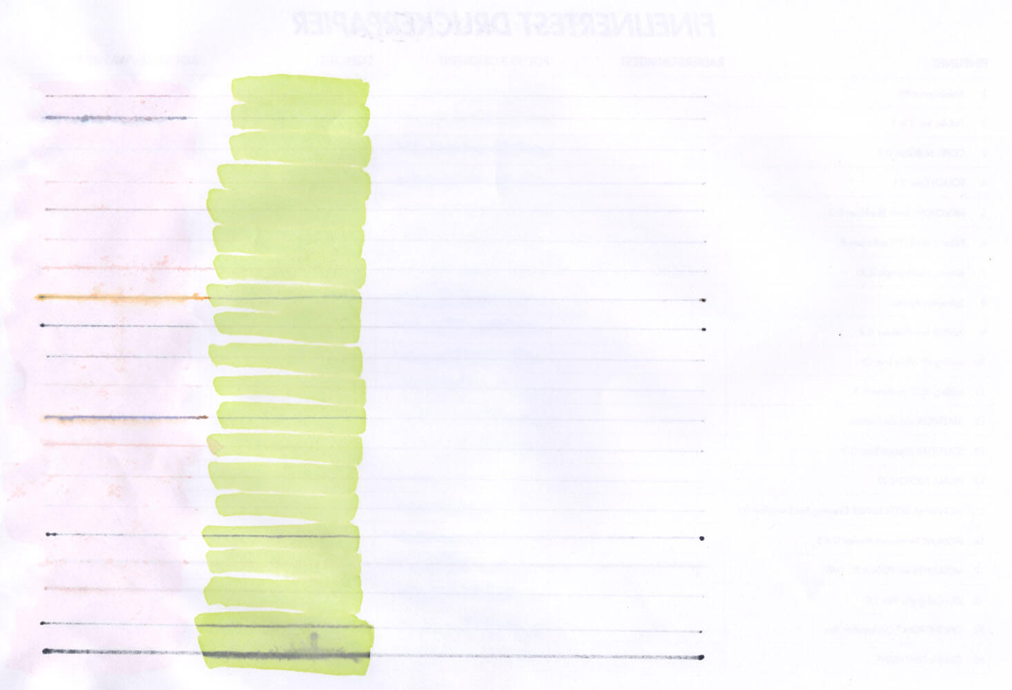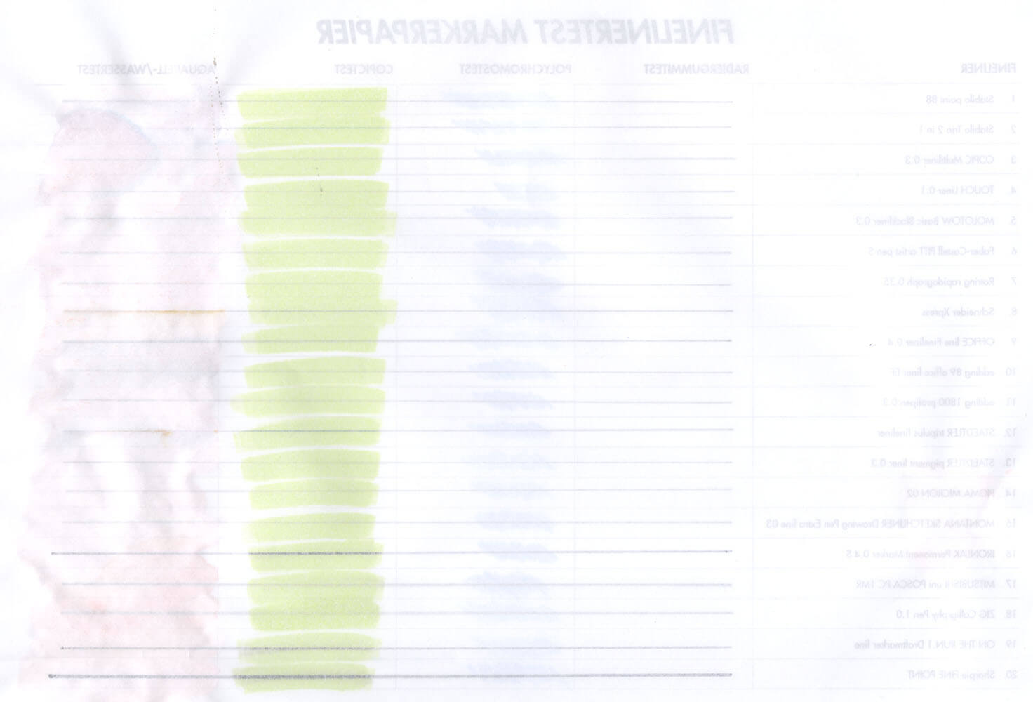 Bei manchen Papieren scheinen sogar die Drucklinien hindurch. Das liegt schlicht an dem dünnen Papier. Und je nachdem wie feucht bzw. stark die Finelinerlinie war, ist auch diese teilweise auf der Rückseite zu erkennen. Richtig durchgedrückt hat dennoch kein Fineliner. Besonders sichtbar auf der Rückseite wurden allerdings manche Linien nach dem Kontakt mit Marker- und Aquarellfarbe.