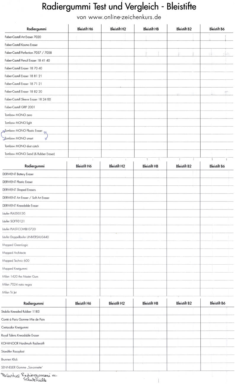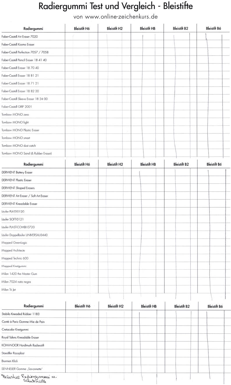 | Mapped GreenLogic | Auch für kleine Stellen geeignet, Handhabung teilweise schmerzhaft, nimmt Radierfarbe auf | viele | Besser bei harten als weichen Bleistiften |
