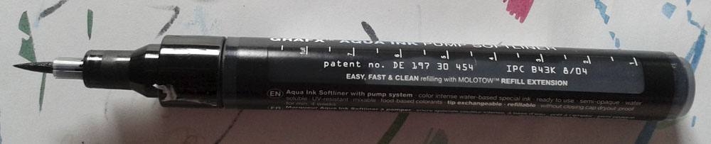 Als ich mir für die verschiedenen Marker-Reviews Material gekauft habe, war bereits ein schwarzer Molotow Grafx Aqua Ink Pump Softliner mit dabei. Meine Neugierde sei Dank kann ich nun diesen Artikel diesem Stift und meinen bescheidenen Erfahrungen damit widmen. 😉