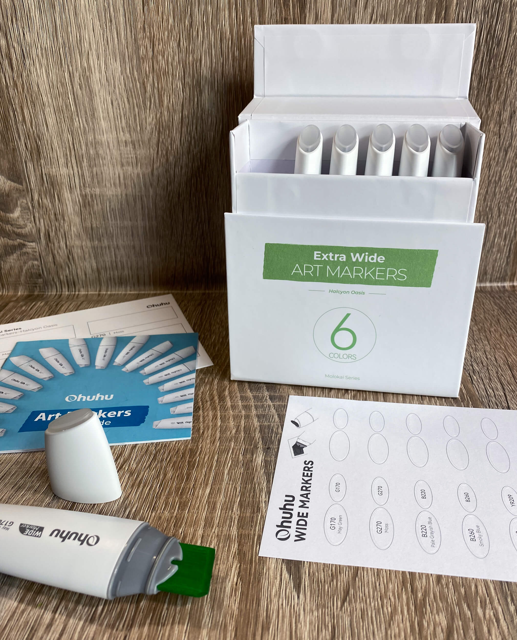 Im Frühjahr 2023 hat Ohuhu noch die Wide Marker rausgebracht, welche mit nur einer sehr breiten und flachen Seite ausgestattet sind. Die Besonderheit bei diesen Stiften ist, dass man erstmalig die Vorschaufarbe auf der Markerkappe selbst ausmalen und dann auf den Stift kleben kann. So hat man sicher eine farbverbindliche Vorschau.