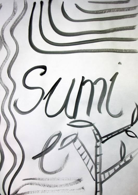 Der japanische Name setzt sich zusammen aus „Sumi“ für „schwarze Tusche“ und „e“ für „Weg“, aber auch „Malerei“. Sumi-e bezeichnet die Kunst der japanischen Tuschemalerei, die gleichzeitig spirituelle Entspannungstherapie ist. Die schlichten, anmutigen Bilder entstehen durch kraftvolle, schnelle aber auch besonnene ruhige Striche.