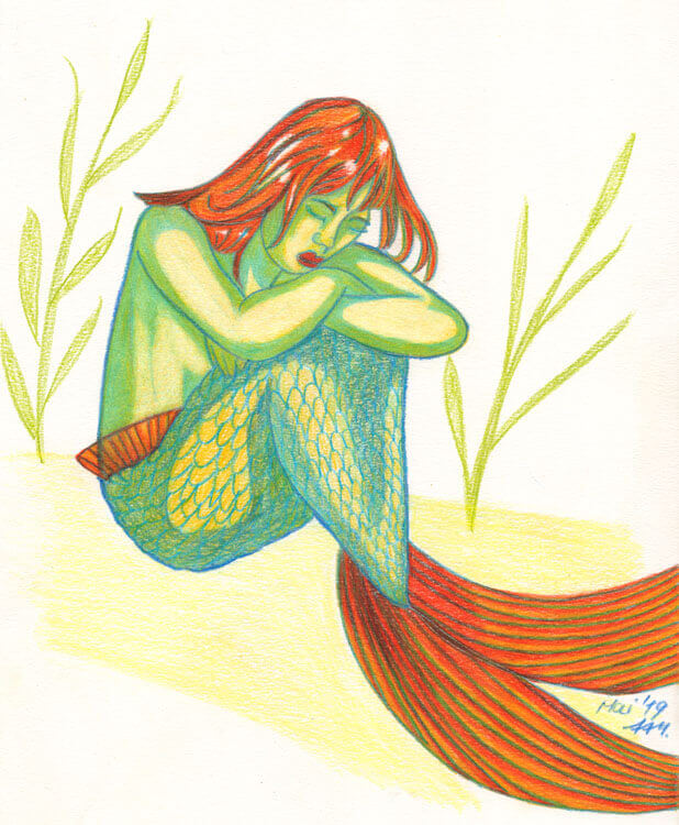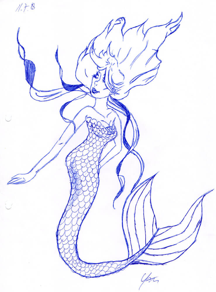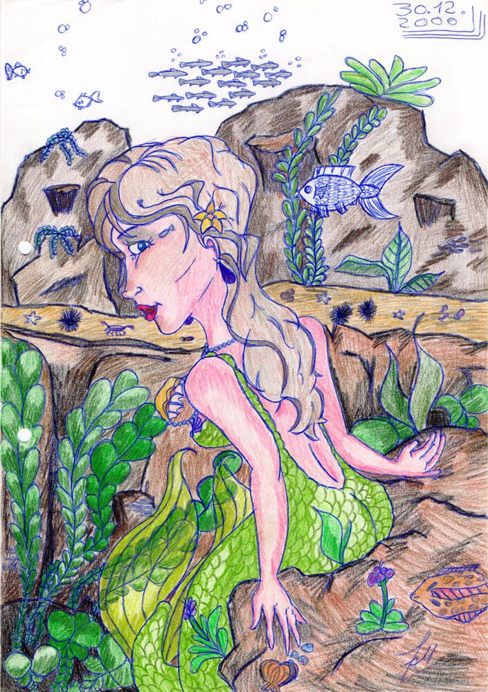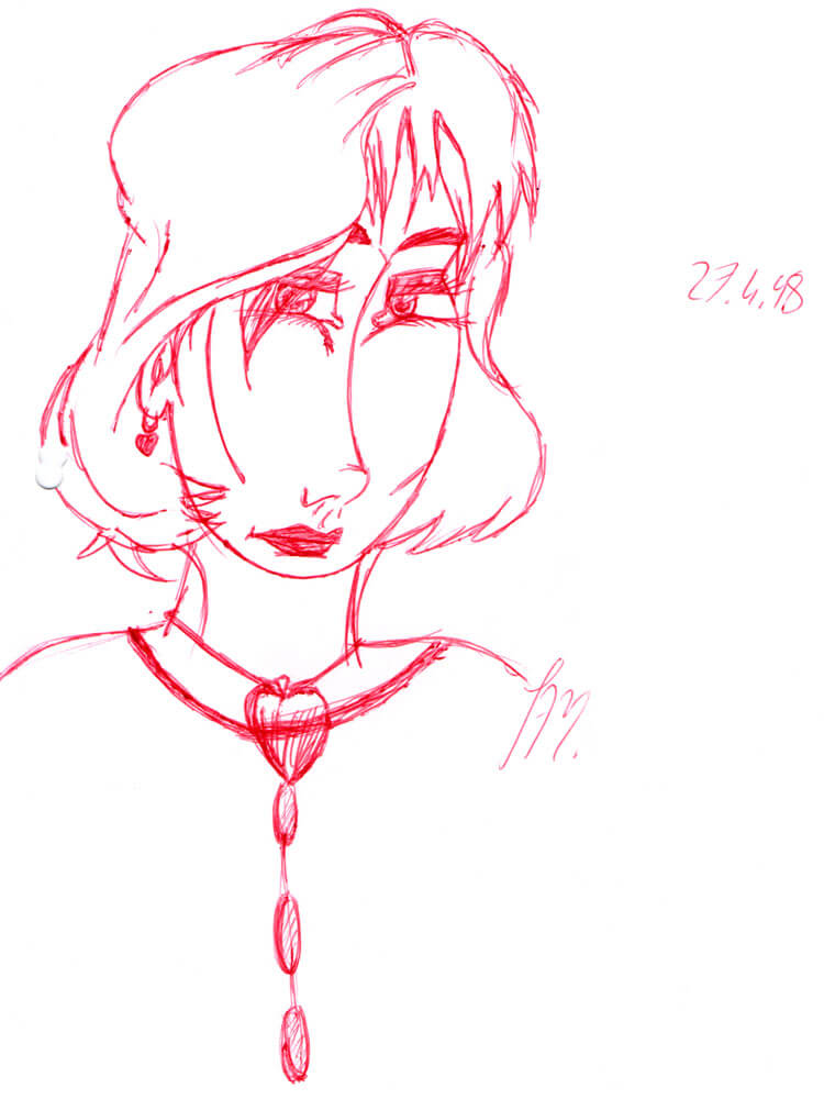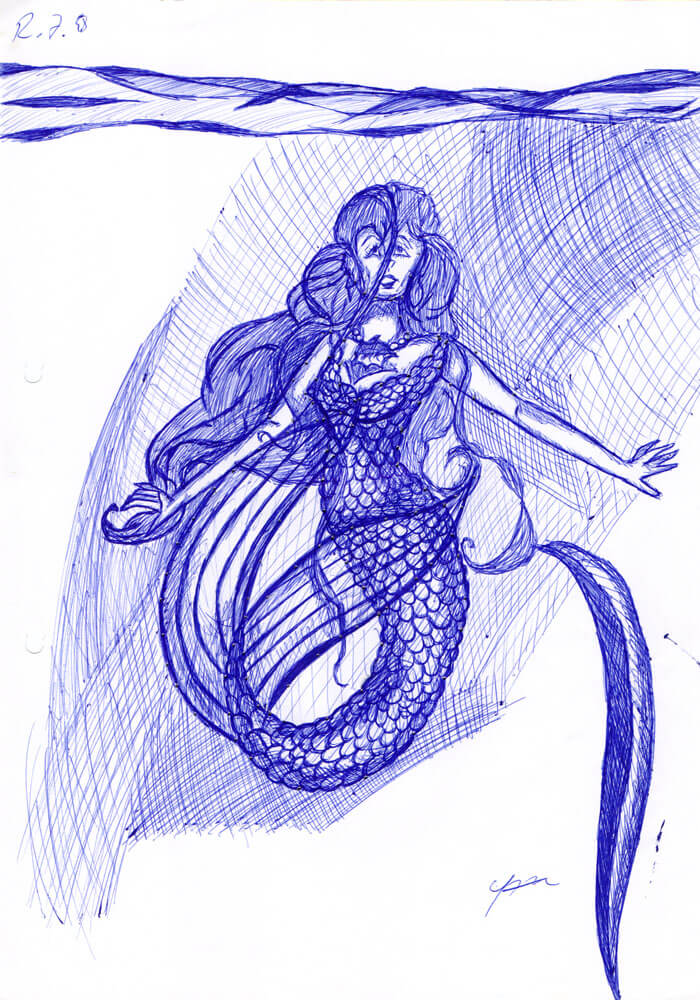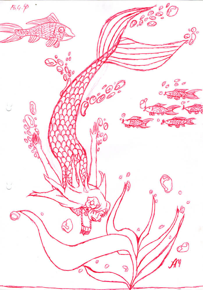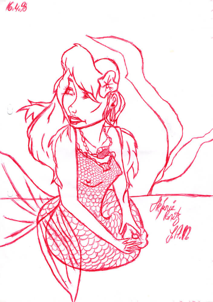 Außerdem habe ich 1998 anscheinend besonders viele Meerjungfrauen mit Kugelschreiber gezeichnet. In dem Fall vermehrt mit rotem Kugelschreiber – der war aus meiner Sammlung dran, weil ich Kugelschreiber nach Kugelschreiber leer gezeichnet habe. 😀