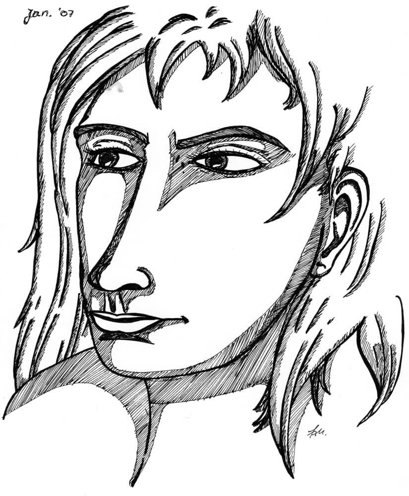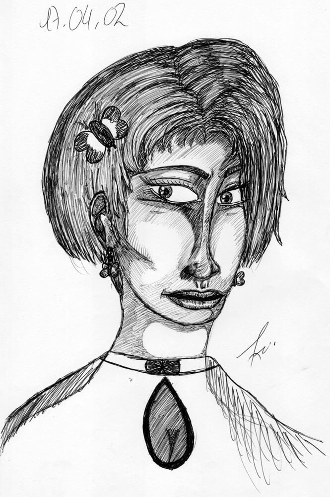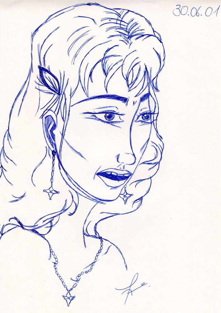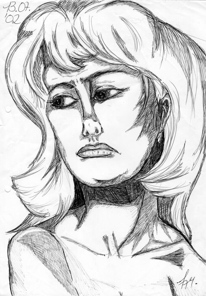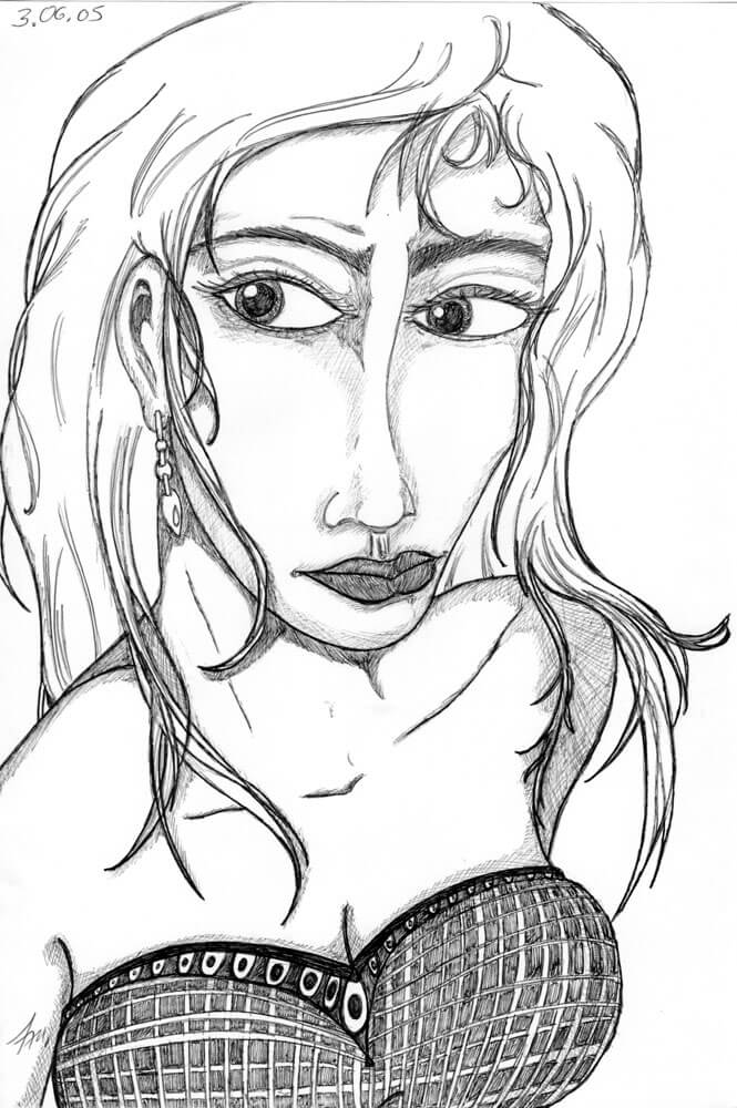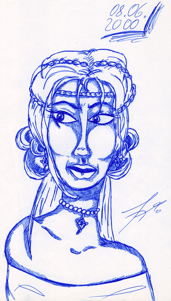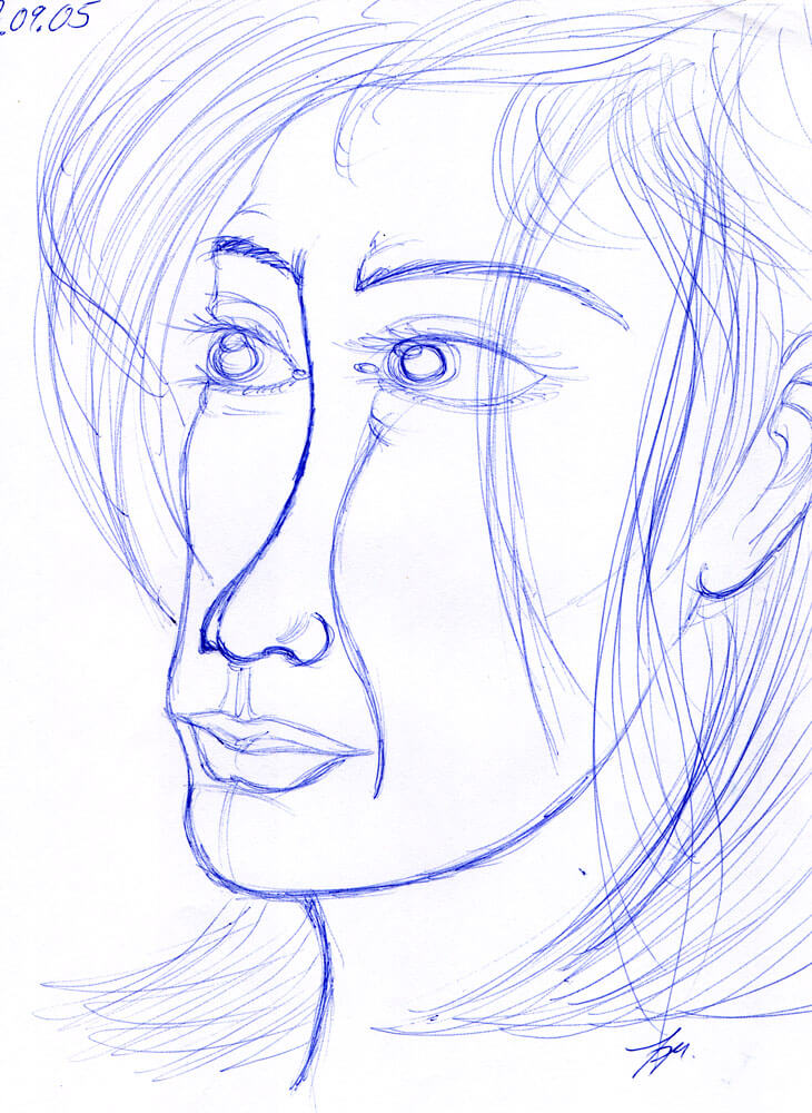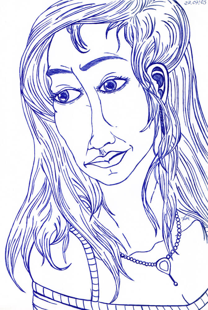 Allmählich komme ich in den Zeitraum in dem ich immer weniger meiner Bilder mit einem Datum versehen habe. So fiel es mir recht schwer genügend Beispiele aus den beiden folgenden Jahren zu finden. Für 2005 kann ich immerhin diese drei Kugelschreiberporträts vorweisen – wie üblich sind es Darstellungen von Frauen, die ich aus dem Kopf heraus gezeichnet habe.
